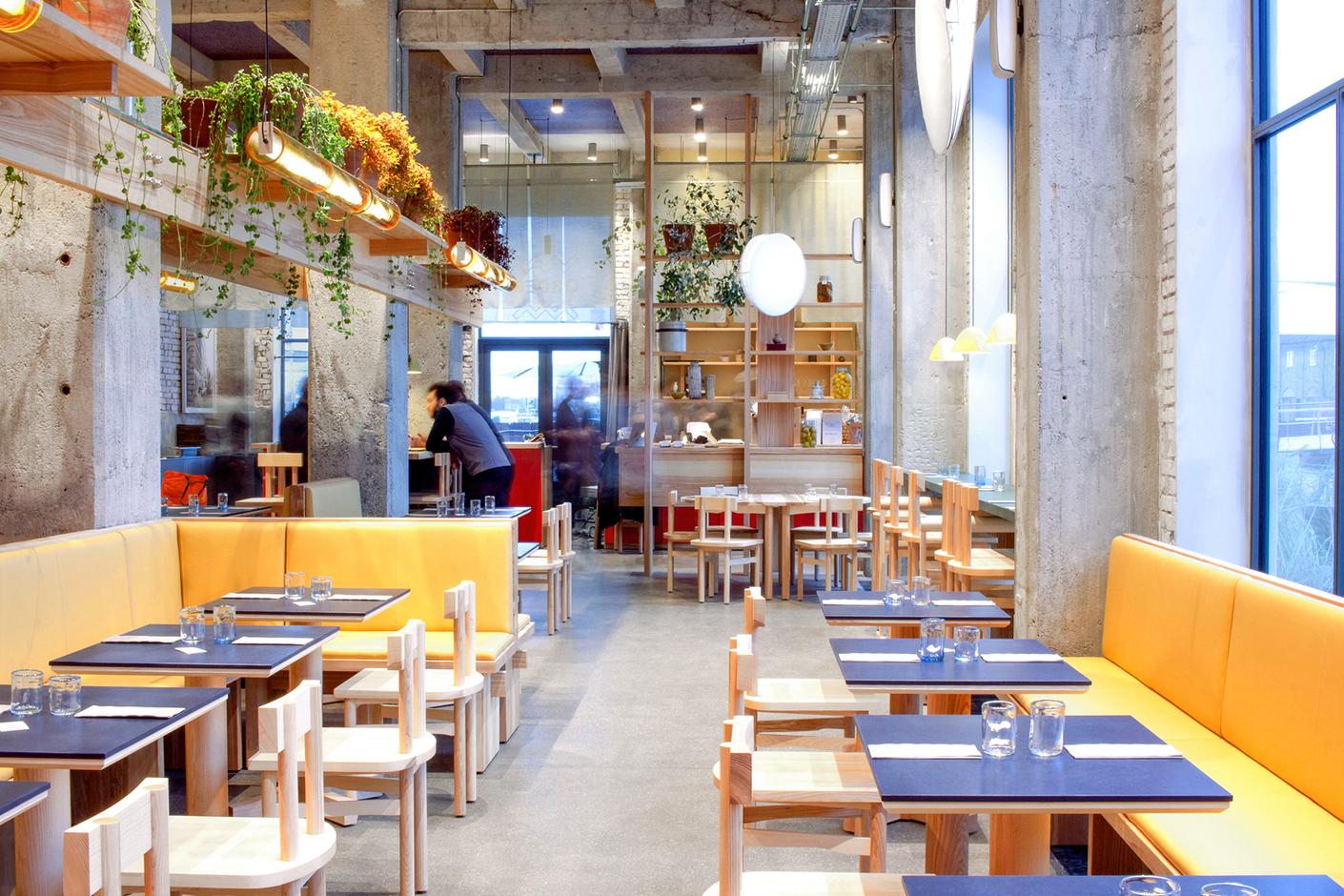 Inspiriert von der entspannten Feinschmeckerküche sowie der Institution japanischer Izakayas, geselliger Kneipen, gibt das Raumkonzept des Kopenhagener Büros Spacon & X den passenden Rahmen. Die interdisziplinären Gestalter unterteilten die 500 Quadratmeter große Lagerhalle in unterschiedliche Zonen. So entsteht dank durchgehender, in einem warmen Gelbton bezogener Bänke eine intime Atmosphäre. Zugleich hoben die Architekten die teils unverputzten Wände sowie die charakteristischen Betonfeiler des Industriebauwerks hervor. Verbunden sind sie durch eine Holzbrücke, auf denen Pflanzenkübel eine Art Blumenbrücke bilden. Sie unterteilt den Raum und relativiert zugleich die Deckenhöhe.