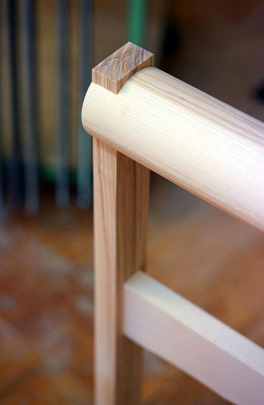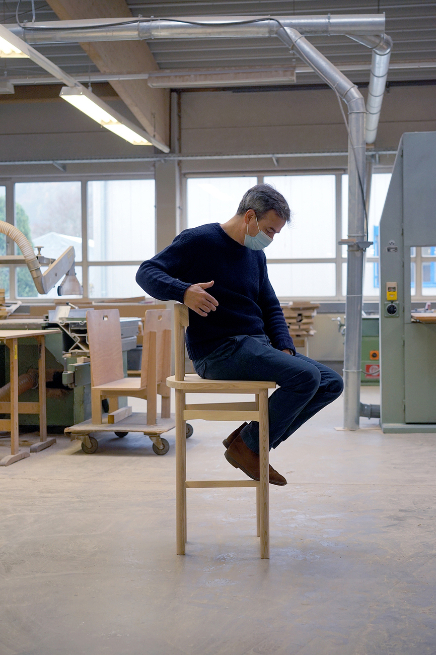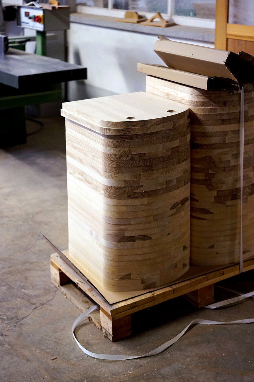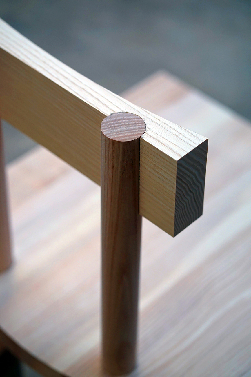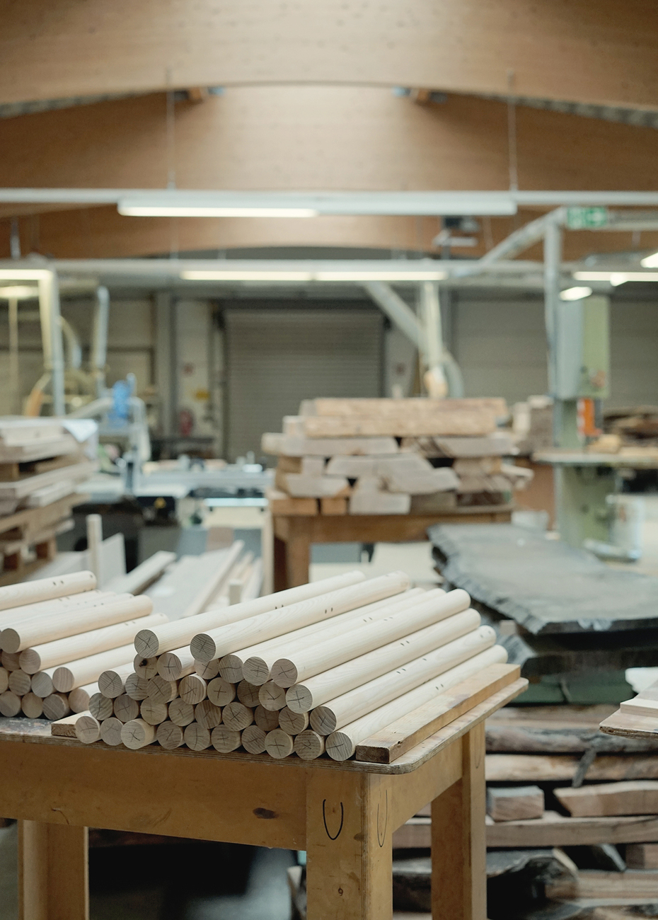 Für die Sitzplätze entwarf Spacon & X gemeinsam mit e15 das Mobiliar. Eine ganz eigene Kollektion von Stühlen, Tischen, Hockern und Garderobenständern entstand, die von einfachen Strukturen und authentischer Handwerkskunst zeugt. Das grundlegende Material ist ein Eschenholz mit braunem Kern. Das Spiel von hellem und dunklen Holz kommt besonders bei den elegant ineinandergreifenden Seiten- und Rückstreben zum Ausdruck. Platten aus dem versiegelten Verbundwerkstoff Richlite, der aus Recyclingpapier und Bioharz besteht, geben den Tischen ein besonders wertiges Aussehen.