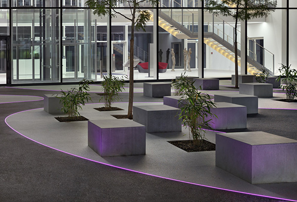 Die neue Enervie-Zentrale in Hagen-Haßley wurde im Mai 2014 fertig gestellt. Nachhaltiges Wirtschaften ist das Motto des Energiekonzerns, der Südwestfalen mit Energie und Wasser versorgt. Um dieses auch im eigenen Unternehmen erfolgreich umzusetzen, war ein Neubau der Firmenzentrale notwendig. Denn zuvor waren Verwaltung und Werkstätten des Betriebes auf insgesamt neun Standorte im Stadtgebiet verteilt: Das führte zu langen Fahrtzeiten und hohen Miet- und Betriebskosten. Die neue Zentrale bündelt nun alle Bereiche des Unternehmens an einem Ort. Hierfür entwarfen JSWD Architekten eine Anlage mit unterschiedlich hohen Bauten. Die umlaufende Fassade aus vertikalen Metall-Lamellen fasst die Baukörper zu einem optisch einheitlichen Komplex zusammen. Den Eingang markiert der höchste Kubus: das neue, viergeschossige Bürogebäude des Energiekonzerns. Dahinter schließen sich die Werkstätten und eine Prüfstelle für Zähler und Schaltanlagen an, verbunden durch eine großzügige Freifläche. Um weitere Kosten zu sparen, wurden Photovoltaik-Anlagen, Solarthermie sowie Kleinwindkraftanlagen im neuen Firmensitz integriert – denn dieser soll sich künftig autonom mit Energie versorgen können. Den Mittelpunkt des Bürogebäudes bildet ein aufwendig gestalteter Innenhof – ein Ort, an dem sich die Mitarbeiter informell treffen, die Mittagspause genießen und sich ein wenig Erholung gönnen. Der Boden des Innenhofes besteht aus zwei verschiedenfarbigen Belägen. Die geschwungenen Flächen der Beläge akzentuieren die Bereiche des Hofes. Kleine Sitzwürfel, Bäume und Beete, die mit Bambus bepflanzt wurden, laden zum Verweilen ein. Das internationale Lichtplanungsbüro Licht Kunst Licht AG Berlin/Bonn, unter Führung von Prof. Andreas Schulz, entschied sich für ein raffiniertes Lichtkonzept, das den Innenhof nicht nur in ein atmosphärisches Licht taucht, sondern zugleich auch als Wegleitsystem dient. Hierfür beauftragten sie die Firma TTC Timmler. Zwischen den unterschiedlichen Belägen wurden insgesamt 120 Meter LED-Lichtlinien eingelassen, die bündig abschließen. Die Lichtlinien sind äußert robust, sodass ihnen auch eine hohe Belastung durch viele Fußgänger nichts anhaben kann. Sie folgen den unterschiedlich geschwungenen Flächen und betonen so auch bei Dunkelheit das Muster auf dem Boden, das durch die beiden Farben der Beläge entsteht. Die unterschiedlichen Radien der Linienführungen waren ohne Probleme realisierbar. Die LEDs tauchen nun das Herzstück der neuen Zentrale von Enervie in ein stimmungsvolles Licht – und verbrauchen, wie es der Bauherr wünschte, nur wenig Energie.