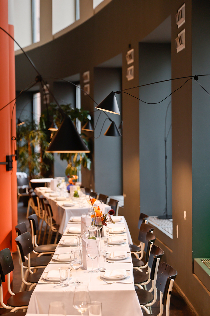 Zur Vernissage erstreckten sich die Textilbänder zudem wie Läufer auf den meterlangen Tischreihen und dienten weißen Glaskugeln als Basis, die mit angenehm diffusem Licht die Plätze der über 120 Gäste aus der Architektur- und Designszene erhellten. Untermalt von sanfter Musik wurde das Badias Schirn Café an diesem Abend zu einem lang ersehnten Treffpunkt für intensive Gespräche, wie zum Knüpfen und Auffrischen der Netzwerke. Parallel zum System "Plusminus" von Vibia leuchtet an den Säulen des Raums die neue Version der Lenkleuchtenfamilie "Ayno", die Stefan Diez für Midgard entwickelt hat: "Ayno Wall". Mit einem werkzeugfreien Aufbau, einer Struktur aus recycelten und recycelbaren Materialien, leistungsstarker LED-Leistung und einem flexibel ausrichtbaren Kegel zeigt sich die Kollektion in jeder Hinsicht effizient. Dank eines Glasfaserstabes, der mit Hilfe des Leuchtenkabels zum Bogen gespannt wird, sind zudem für die Leuchten keine Gelenke notwendig. Stattdessen wird die gewünschte Position ganz leicht durch das Verschieben der beiden Verstellringe erreicht. Wie variantenreich die "Ayno" Modelle sind, können die Gäste beim Gang durch das Badias Schirn Café anhand der charmanten Versionen als Steh- und Tischleuchte in Augenschein nehmen. Und je später der Abend wird, umso mehr kommen die Leuchten zur Geltung und sorgen für eine einzigartige Wohlfühlatmosphäre. Dank der bodentiefen Fenster des Baus strahlt ihr Licht auch weit hinaus in die Gassen der Frankfurter Altstadt. Am Eröffnungsabend wurde bis weit nach Mitternacht die herrliche Atmosphäre gefeiert, die die Lichtinstallation im Badias Schirn Café gestaltet sowie die kulinarischen Höhepunkte der ausgezeichneten Küche von Badia Ouahi genossen. Die Installation wird ganz im Sinne der Nachhaltigkeit im Badias Schirn Café der Schirn Kunsthalle verbleiben.