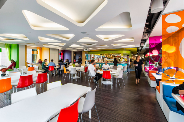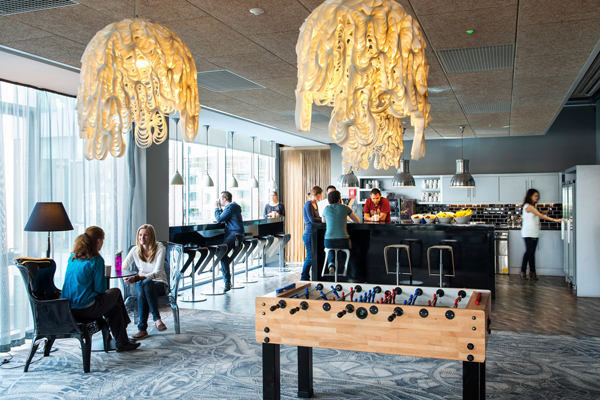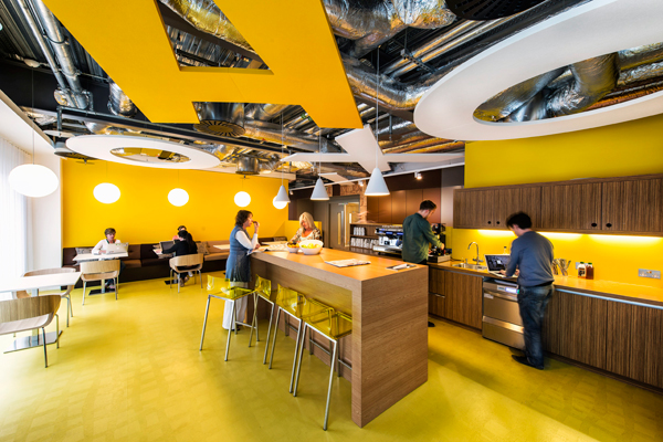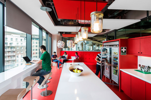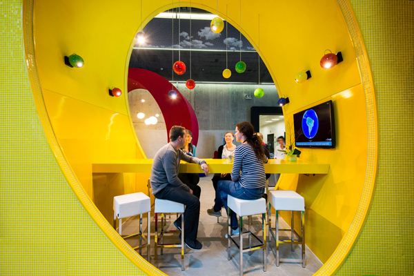 Das Schweizer Architekturbüro Camenzind Evolution hat schon verschiedene Büros für Google eingerichtet, aber ob in Tel Aviv, Moskau oder wie in diesem Falle Dublin, immer entsteht ein kunstvolles Durcheinander, eine überraschende Vielfalt von Stilen in verschiedenen Zonen. Kleine oder größere Besprechungsräume, Ruhebereiche oder Rückzugsorte haben alle einen unterschiedlichen Look, der unterschiedlichen Funktionen aber auch unterschiedlichen Geschmäckern entspricht. Der Stilbruch ist Prinzip und vertreibt die Monotonie der Großraumbüros. In Dublin bezog Google mit seiner Europazentrale das höchste Gebäude der Stadt – genannt „Google Docks“. Die Büros und verschiedenen Lounges haben einen fantastischen Blick über die Stadt. Schon im Eingangsbereich grüßt das bekannte Logo die Besucher, aber hier ist es überdimensional vergrößert und wird als Empfang, Sitzmöbel und Cafétresen genutzt. Die kräftigen Farben des Logos tauchen auf den unterschiedlich eingerichteten Etagen als Grundton der recht bunten Einrichtung wieder auf. Dazu passten die Möbel von Pedrali, die zum Teil in vielen verschiedenen Farben produziert werden, wie beispielsweise der Barhocker Kuadra. Barmöbel in einem Bürogebäude? Bei Google ja, denn das Bürogebäude hat auf den 20.000 Quadratmetern Fläche auch Fitnessräume, einen Swimmingpool und – natürlich – einen Irish Pub mit Billardtischen sowie zahlreiche eigenwillig gestaltete Lounges zum Entspannen und zwanglosem Konferieren. Die Inneneinrichter beschränkten sich nicht auf eine Serie von Stühlen wie in anderen vergleichbareren Projekten sondern orderten gleich elf verschiedene Modelle von Pedrali. Und auch der hohe Anspruch an ökologische Baukriterien, das Gebäude folgt den LEED-Kriterien, konnte Pedrali mit langlebigen, umweltschonend hergestellten Möbeln entsprechen.
