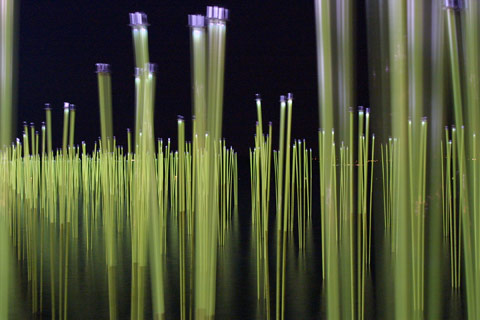 Der Seeblick lockt: Die Projekt-Teams arbeiten nun nach Themen in den ehemaligen Zimmern, die zum Erschließungsgang hin geöffnet wurden. Eine Art Schaufenster schließt den Bau rückwärtig ab. In den Nischen sind Objekte, Prototypen und Materialrecherchen versammelt. Hier wird deutlich, wie viel Engagement atelier oï in Experimente und konzeptuelle Arbeit steckt. Mandate von großen Marken, für die das Studio immer häufiger tätig ist, geben ihnen den Freiraum dafür. „Wir arbeiten nach dem Hefe-Prinzip: Ein Projekt führt zum nächsten", sagt Aebi. So erkundeten die Gestalter beispielsweise intensiv die gestalterischen Möglichkeiten der Kordel. Seile winden sich da zur Garderobe und schlingen sich zur Sitzgelegenheit, die Kordel wird sprichwörtlich zum roten Faden in einer Ausstellung des Mudac in Lausanne, Schnüre umspannen wie eine Nähgarnspule die Hocker „Reel" (2009) für B&B Italia. Durchexerziert wird auch das Thema Stäbe: Bei der Schweizer Landesausstellung „Expo.02" bekommt das Ausstellungsgelände am Seeufer der Stadt Neuchâtel ein leuchtendes Schilffeld aus Stäben. Bronzefarbene Stangen prägen die Breguet-Shops weltweit, metallische Stäbe bringen die poetischen Leuchten „Allegretto" (2009) für Foscarini zum Klingen. Kreative Kettenreaktionen, nennt dies Aurel Aebi. Neuerdings haben sie das Material Glas erkundet. Anlass war ein Auftrag von Bulgari, einen Flakon für das Parfüm „BLV II" zu entwerfen. „Wir mussten einen Duft in Szene setzen, ein ebenso flüchtiges wie kostbares Gut". Lange tüftelte man an dem richtigen Farbton des Parfüms, dessen zartes Blau nun die linearen und geschwungenen Formen des kristallenen Gehäuses betont.