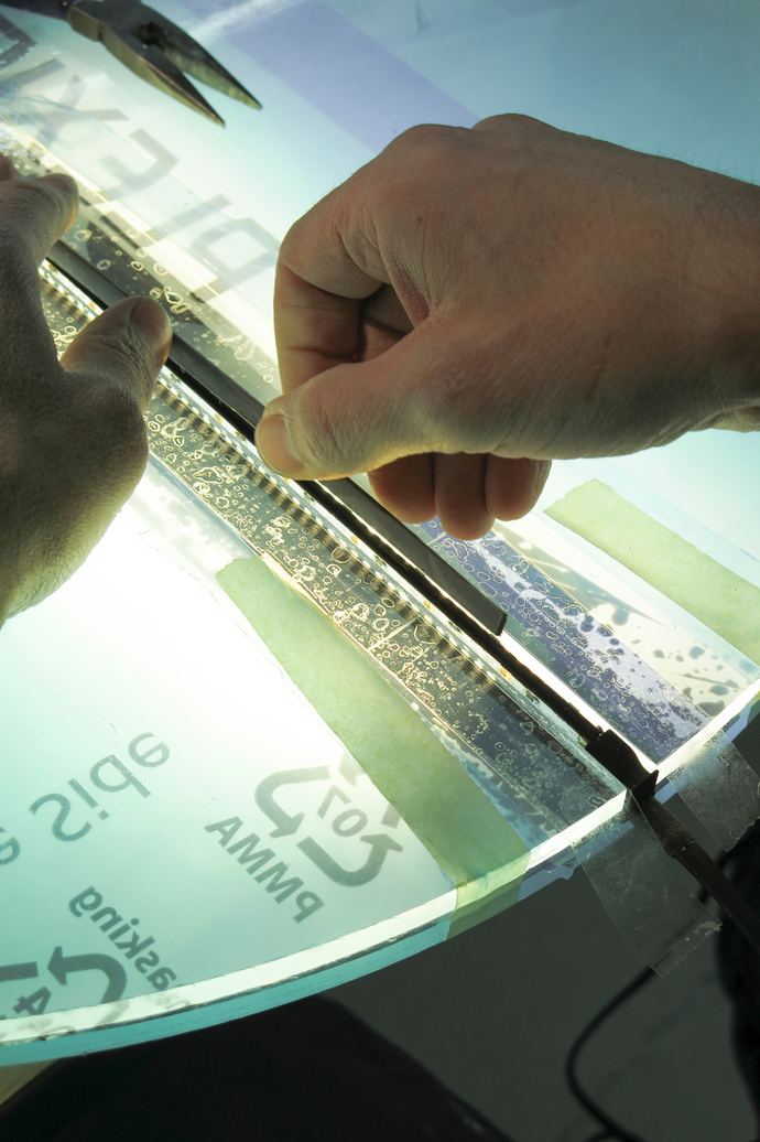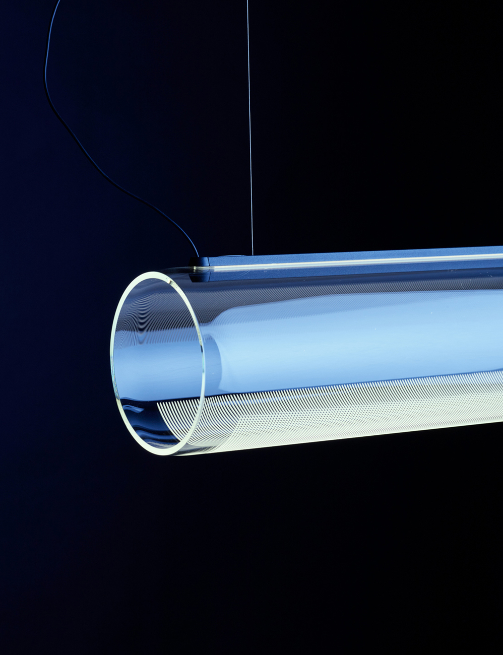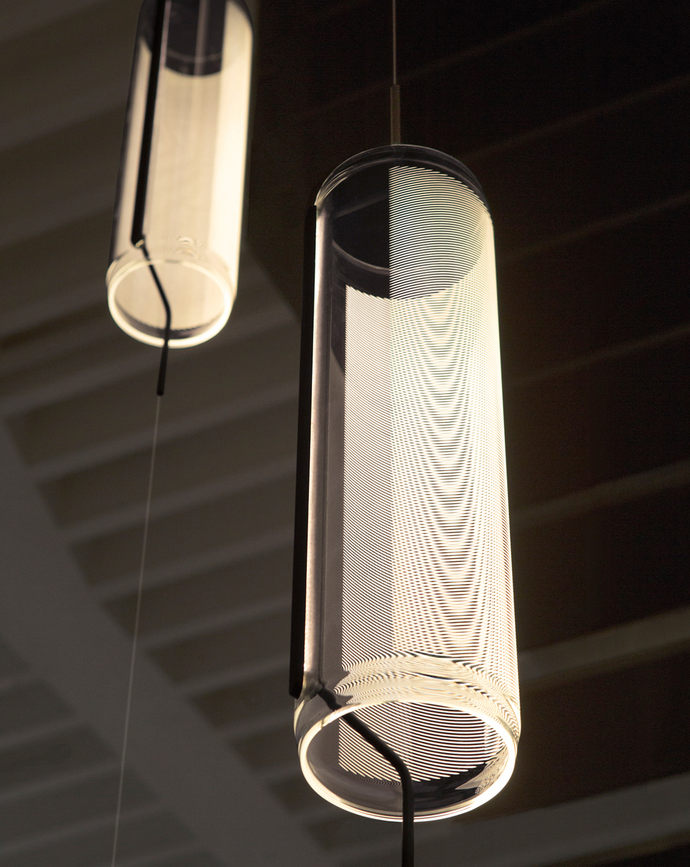 Inspiration für "Guise" lieferte dem Designer zwei technische Verfahren, die so wohl noch nicht zusammengebracht wurden: Das Phänomen der Totalreflektion, welches von Notausgangs-Schildern und LCD-Monitoren bekannt ist und die Handwerkskunst des böhmischen Glasschnitts. Wird Licht seitlich in eine Glasscheibe eingespeist, dann reflektiert es von der einen auf die andere Seite, ohne auszutreten, es verbleibt also im Glas. Erst ein Schliff oder eine offene Kante bietet diesem einen Weg nach außen. "An der Stelle wo die Glasoberfläche unterbrochen wird, fängt es an zu leuchten", so Stefan Diez. Das Licht geht so über die Muster der Gravuren vom Glaskörper selbst aus und wirft keine Schatten. Die LED-bestückten Boards, die wie eine filigrane Naht den Glaszylinder unterbrechen, bleiben dabei praktisch unsichtbar. Das Ergebnis: Pures Licht, ohne Störfaktoren wie sichtbare Leuchtmittel oder Reflektoren. Zur Regulierung von "Guise" dient ein Sensor, der durch die Annäherung an das Objekt ausgelöst wird. Der nächste Schritt für die Weiterentwicklung der Kollektion führt Stefan Diez ins Freie – aktuell denkt der Designer über eine Outdoor-Variante von "Guise" für Vibia nach.