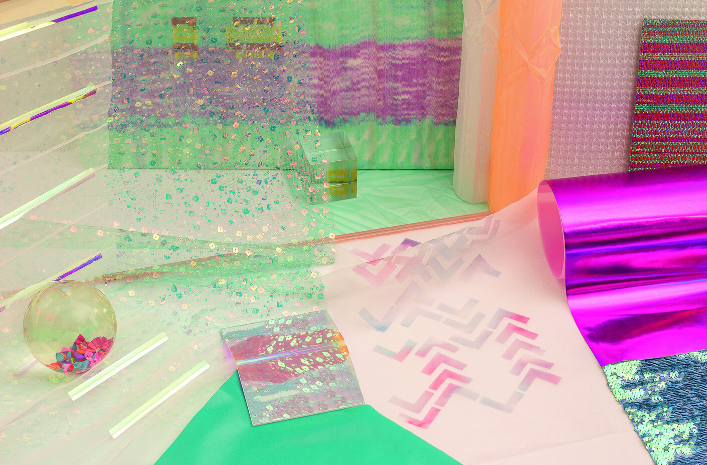 Auf diese Weise entstehen holografische Brillanz, sanfter Perlmuttschimmer und florale Strukturen. Organisch-tierische Strukturen, etwa Zellen, werden imitiert und schaffen eine faszinierende Dreidimensionalität. Leuchtende Farben von Türkis über Pink bis zu Orange und klarem Blau verbinden sich zu einer künstlichen Landschaft, wodurch eine faszinierende Optik entsteht. Zudem bieten techno-organische Stoffe anziehende Haptiken und imitieren mal den Schimmer von Seide, mal die Spiegelungen von Wasser.