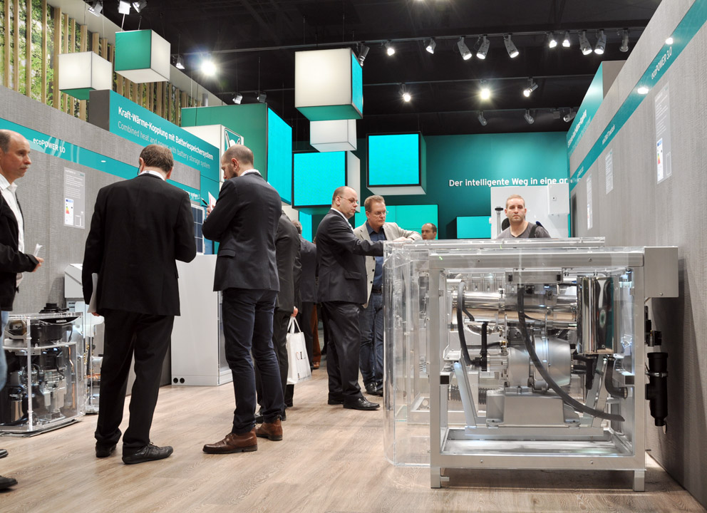 Die derzeitige Nummer drei unter den deutschen Heizungstechnik-Unternehmen Viessmann scheint den Wettbewerbern gestalterisch längst enteilt. Mit 2,2 Mrd. Euro Umsatz und derzeit 11500 Mitarbeitern ist das Unternehmen wie Vaillant bis heute im Familienbesitz und präsentiert die gesamte Breite der Heizungstechnik. Trotz der damit verbundenen Vielfalt konzentriert sich Viessmann auf drei Hauptthemen „Hybrid“, „Connect“ und „Power“. Das Standdesign korrespondiert perfekt mit der im Jahre 1967 von Rambald von Steinbüchel entworfenen Messehalle. Drei jeweils acht Meter hohe Türme bilden den Blickfang des Messeauftritts. „Hybrid“ steht für Heizanlagen, die Brennwert- und Wärmepumpengeräte kombinieren, wobei jeweils automatisiert die günstigste Betriebsweise abhängig von Außentemperatur und Energiepreis optimiert eingestellt wird. Unter dem Stichwort der Vernetzung wird das Gebäude-Energiemanagement per Touchdisplay oder App vorgestellt. Beim Thema „Power“ geht es um Stromerzeugung, Nutzung und Speicherung, wobei die Kraft-Wärme-Kopplung mit Stirling-Motor und Brennstoffzelle im Vordergrund steht.