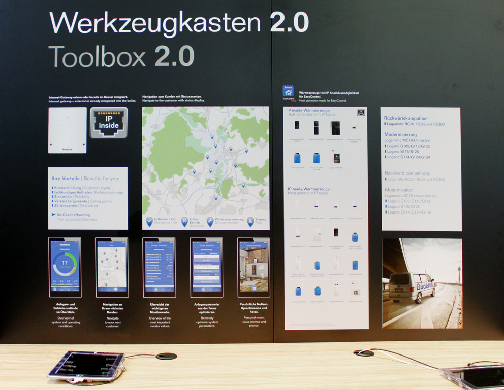 Doch was offeriert die ISH an veränderten Leitbildern? Wie verhalten sich Marken und Herstellergruppen zueinander? Das Internet der Dinge, die digitale Steuerung komplexer Heizungstechnik in den Händen der Nutzer, wird mit der aktuellen Gerätegeneration zum Normalfall. Mit Apps, Smartphone und Tablet lassen sich individuelle Einstellungen vornehmen und die Energienutzung dokumentieren. Zugleich erlaubt die Vernetzung dem Installateur die Ferndiagnose der Heizung, was Zeit und Kosten sparen soll. Mit der damit veränderten Beziehung von Hersteller und Kunde erhält die Bekanntheit der Marken neues Gewicht. Für die Bosch Thermotechnik, mit 3,2 Mrd. Euro Umsatz und rund 13500 Mitarbeitern (Stand: 2013) derzeit weltweit größter Anbieter der Branche, hat dies Konsequenzen.