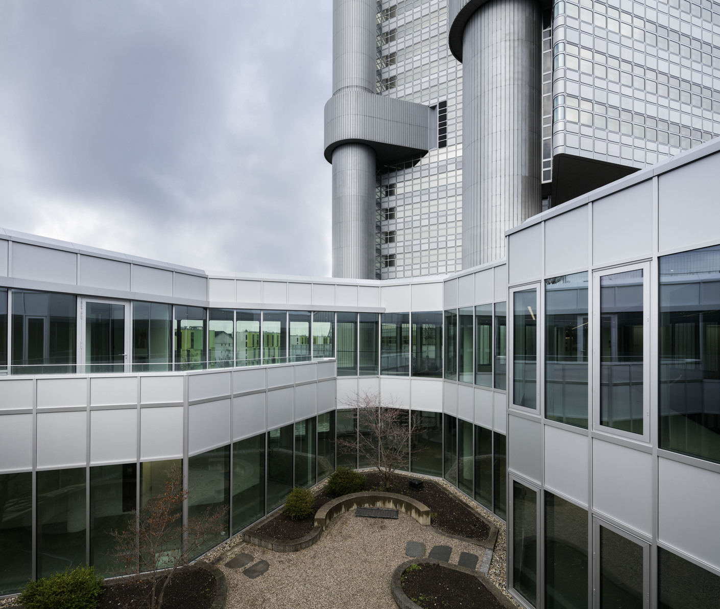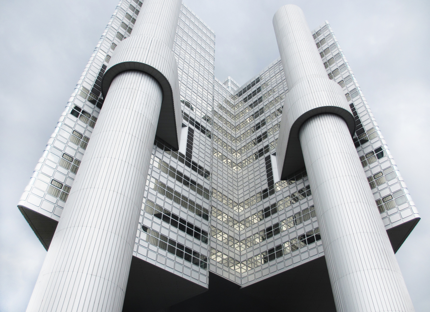 Auf einem breiten Sockelbau ragen vier runde Megastützen empor, die den freitragenden Hochhauskern in der Grundrissform dreier gleichschenkliger Dreiecke mit riesigen Schellen umklammern. Die ungewöhnlichen zylinderförmigen Tragelemente, die die Versorgungsleitungen und die Erschließung aufnehmen, verleihen dem Turm seine eigenwillige Form. Weite und flexible Grundrisse für eine vielfältige Organisation der Büroräume und Arbeitsflächen werden so möglich.