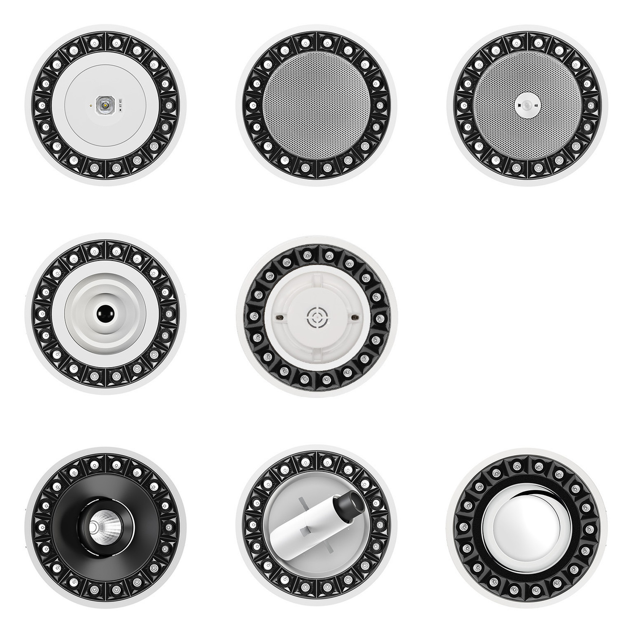 "Blade R – All in One" von iGuzzini ist mehr als ein professionelles Downlight: Die Deckeneinbauleuchte mit LED-Lichtring ist multifunktional und individualisierbar. In den Lichtring, der in drei Größen von 80 bis 170 Millimeter erhältlich ist, kann zum Beispiel ein schwenkbares Downlight oder Spotlight, ein Lautsprecher, ein Rauchmelder, eine Notbeleuchtung oder eine Sicherheitskamera eingebaut werden. Die Abstrahlung und Lichtfarbe ist für eine energiearme Nutzung je nach Bedarf über Smart Services und Bluetooth konfigurierbar. Um "Blade R" ohne Störfaktoren in die Architektur zu integrieren, können neben der Farbgebung in Weiß, Schwarz und Schwarz-Weiß auch individuelle Finishes ausgewählt werden. (am)
