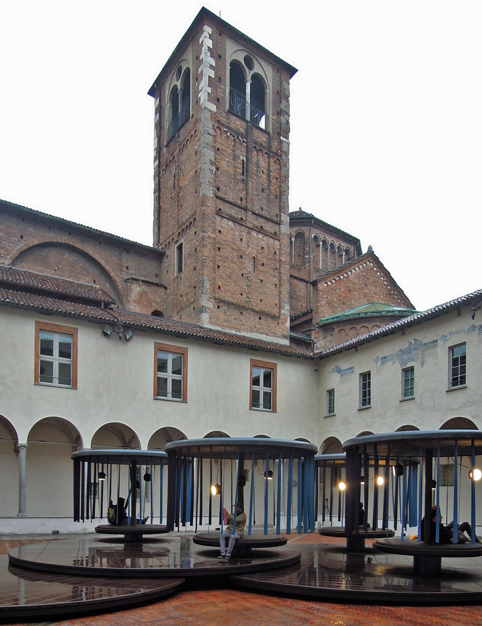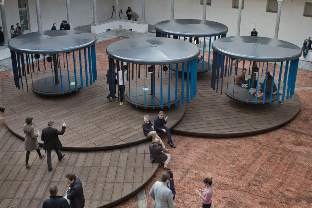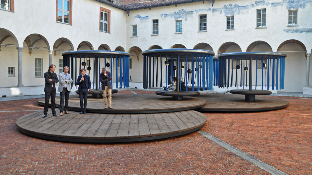Samtweich und geräuschlos drehen sich die vier karusselartigen Gebilde im Innenhof der Katholisch-Theologischen Fakultät an der Via Cavalieri del Santo Sepolcro. Die Besucher, die sich hier eingefunden haben, erscheinen wie Statisten in einem modernen Stummfilm. Manche stehen in respektvollem Abstand, andere sitzen auf den Flächen dieser monumentalen futuristischen Installationen, die sich unentwegt im Kreise drehen. Sanft wiegen sich die am Dach angebrachten blauen Stoffstreifen im Fahrtwind. Und jeder fragt sich, was das bloß zu bedeuten hat? „Quiet Motion“, also „stille Bewegung“, so betitelt BMW dieses Projekt in Zusammenarbeit mit dem französischen Designerduo Erwan und Ronan Bouroullec, mit dem der Autobauer zum diesjährigen Salone del Mobile Designer, Presse und Messebesucher zum Stelldichein lädt, um über Mobilitäts-Konzepte der Zukunft sinnieren.