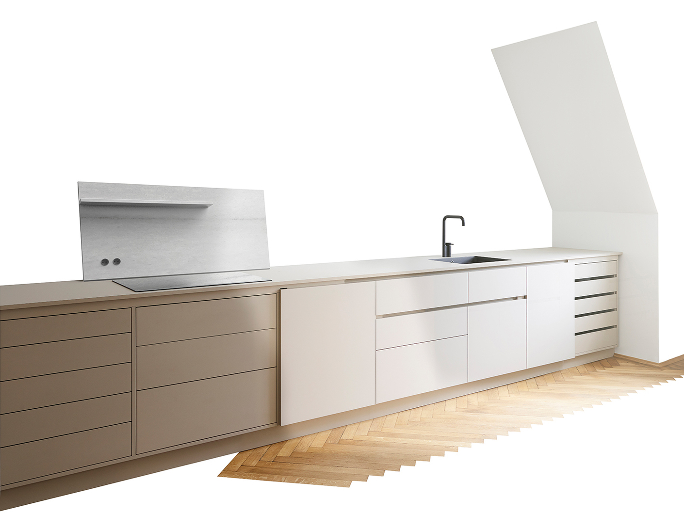 Bei der Vorbereitung des Projektes wurde den drei Designern allerdings klar, dass sie mit ihrem Entwurf zugleich auch eine Marktnische finden mussten. Denn in allen Preissegmenten des Küchenmarktes ist die industrielle Fertigungsqualität mittlerweile so hoch, dass Manufakturen wie Holzrausch eigentlich keine konkurrenzfähigen seriellen Produkte anbieten können. Schließlich erkannten Heinzelmann, Relvão und Kellermann, dass sie beim Grundprinzip ansetzen mussten: Anders als bei industriell gefertigten Küchen besteht das neue System nicht aus nebeneinandergestellten Einzelelementen. An die Stelle der im Küchenbau üblichen doppelten Zwischenwände tritt eine Konstruktion, die nur mit nur einer Trennwand auskommt. Dafür entwickelten die Designer eine technische Lösung, deren Grundbestandteile Rahmen und Zwischenelemente sind. Besonders wichtig bei ihrem Entwurf war Ana Relvão, Gerhardt Kellermann und Jan Heinzelmann der "Möbelcharakter", den ihre Küche haben sollte. Zudem wollten sie jede Form von Blenden und Abdeckungen vermeiden: "Blenden und Abdeckungen spielen bei industriell gefertigten Küchen eine zentrale Rolle", erklärt Ana Relvão. "Je schöner die Abdeckung, desto wertiger und teurer die Küche. Wir wollen aber nichts verdecken. Die Struktur soll sichtbar sein und die Konstruktion ablesbar."