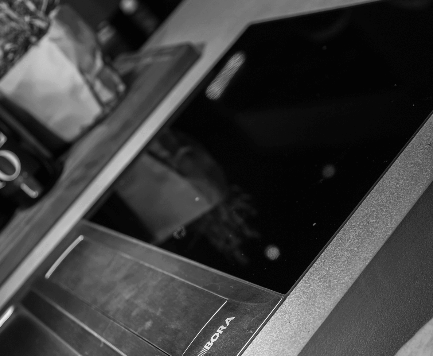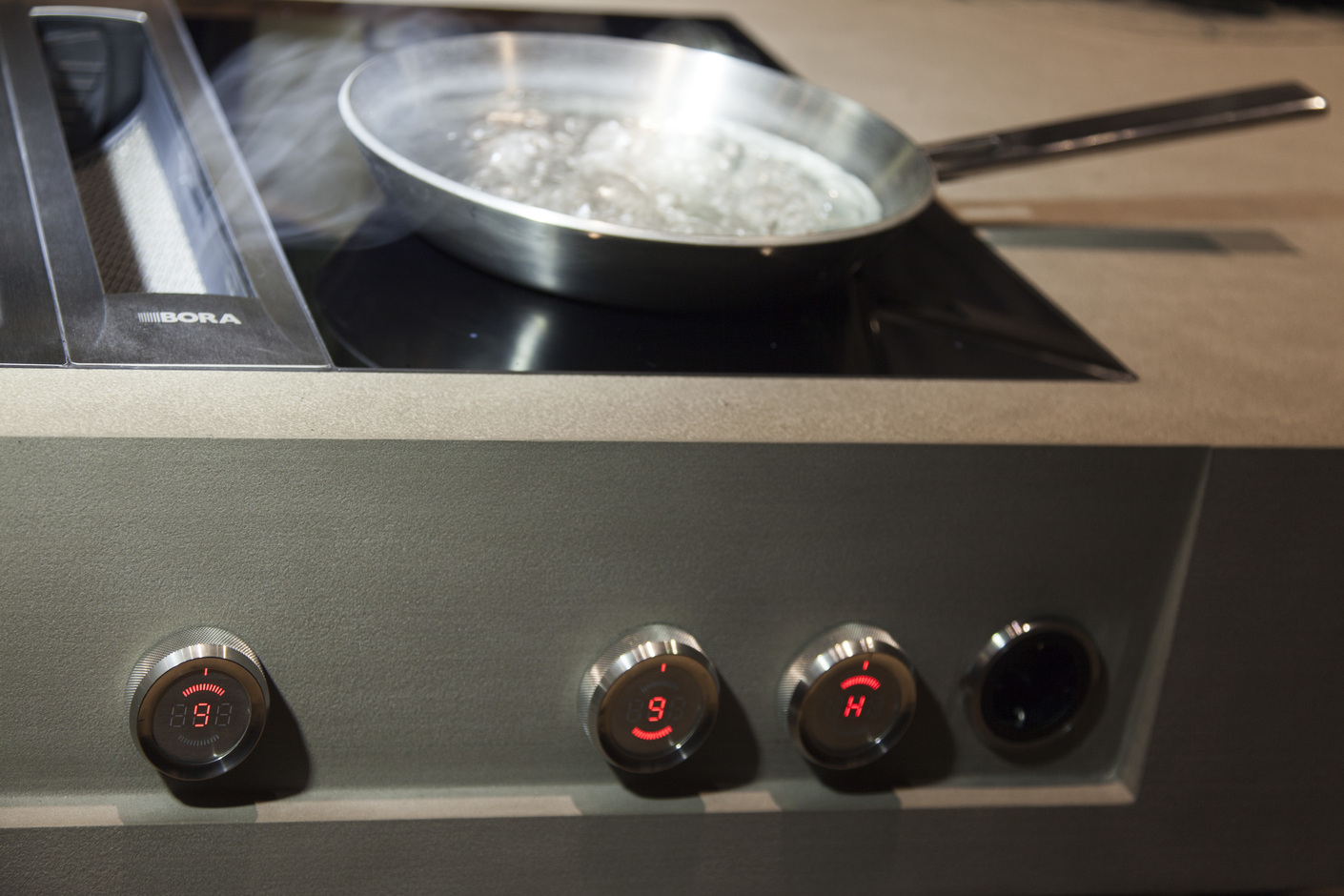 Bei Bora ist der sichtbare Teil des Kochfeldabzuges deutlich schlanker dimensioniert. Ein Schlitz ist mit einer Edelstahlabdeckung verschlossen, die sich bei eingeschalteter Lüftung wie von Geisterhand öffnet. Der Abzug und die beiden Kochfelder bilden, anders als bei Gaggenau und Miele, bei Bora keine feste Einheit. Der Kunde kann zwischen unterschiedlichen Konfigurationen wählen, so dass etwa auf der einen Seite des Lüftungsschlitzes der Bora Tepan-Edelstahlgrill und auf der anderen ein Gas- oder Induktionskochfeld eingebaut werden kann. Alle verschmutzenden Teile des Abzugssystems sind aus Edelstahl gefertigt und können leicht entnommen und gereinigt werden. Die Steuerung bei Bora erfolgt in gewohnter Art und Weise über Drehknöpfe an der Herdfront. Die in den Knöpfen integrierten Displays sind, nachdem man sich an sie gewöhnt hat, ein echter Gewinn. Insgesamt beeindrucken die Eleganz und Bedienungsfreundlichkeit des Bora-Systems.