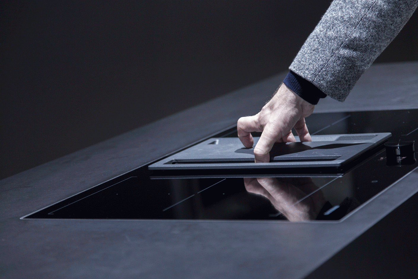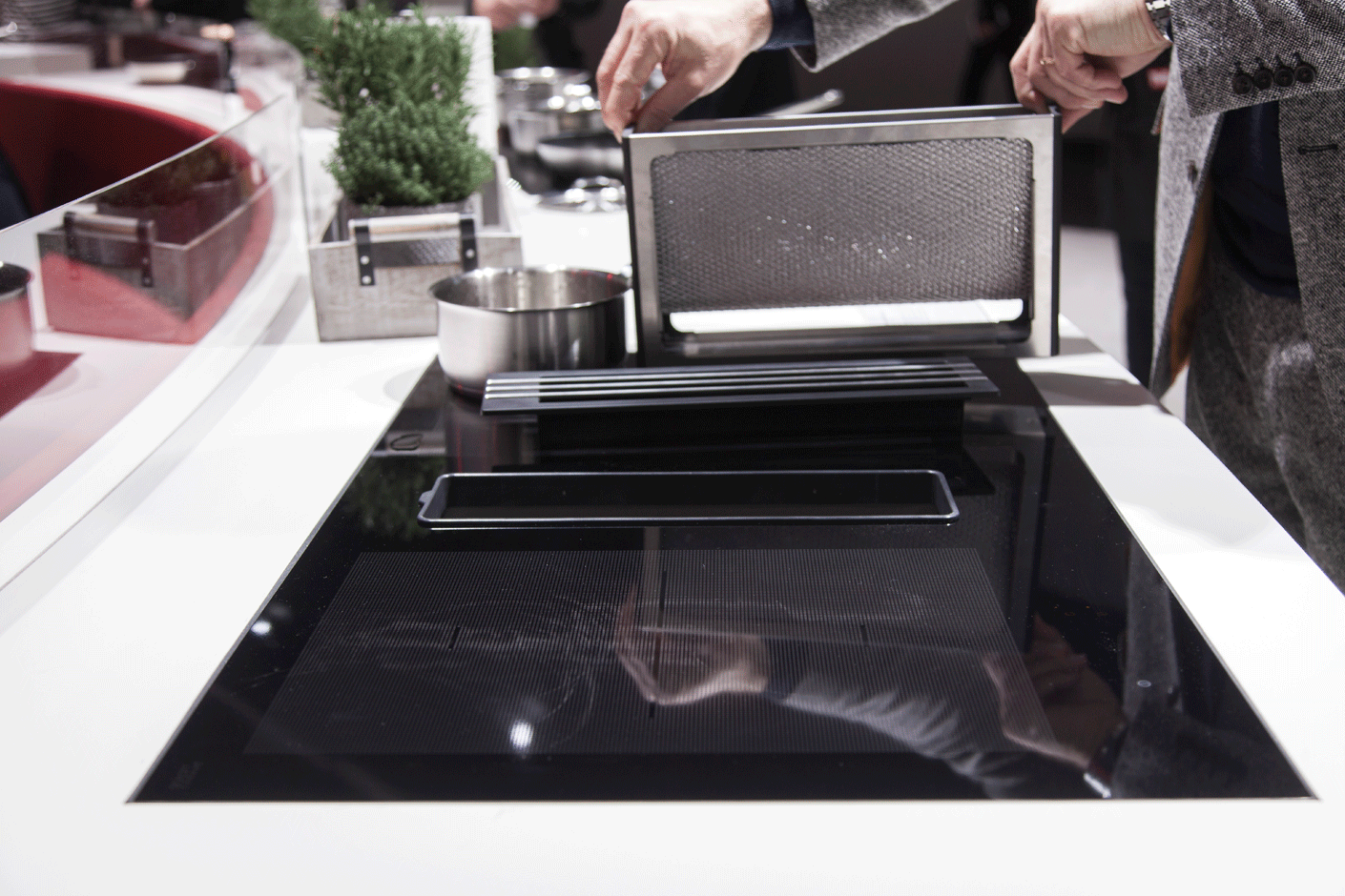 Auch bei Gaggenau flankieren den Kochfeldabzug zwei Induktionskochzonen, hier mit je zwei rechteckigen Kochflächen. Der Lüfter nimmt deutlich mehr Fläche ein als bei Bora und Miele und zieht die Luft durch zwei Schlitze ein. Gaggenaus Lüftungssystem ist durch seine Größe in der Lage, enorme Mengen Fett aufzunehmen und besitzt ein ausgeklügeltes System an Schutzmechanismen gegen Filtrataustritte. Bedient wird das Kochfeld über die sogenannte Twist-Pad-Bedienung auf dem Kochfeld: Mit einem abnehmbaren Magnetdrehknopf steuert man die einzelnen Kochflächen an und reguliert ihre Temperatur. Das System ist etwas gewöhnungsbedürftig und man sollte tunlichst den Drehknopf nicht verlieren. Ist die Platte aber erst einmal eingeschaltet, läuft alles von allein. Das Lüftungssystem erkennt sensorgesteuert, dass gekocht wird und passt sogar seine Leistung den jeweiligen Erfordernissen an.