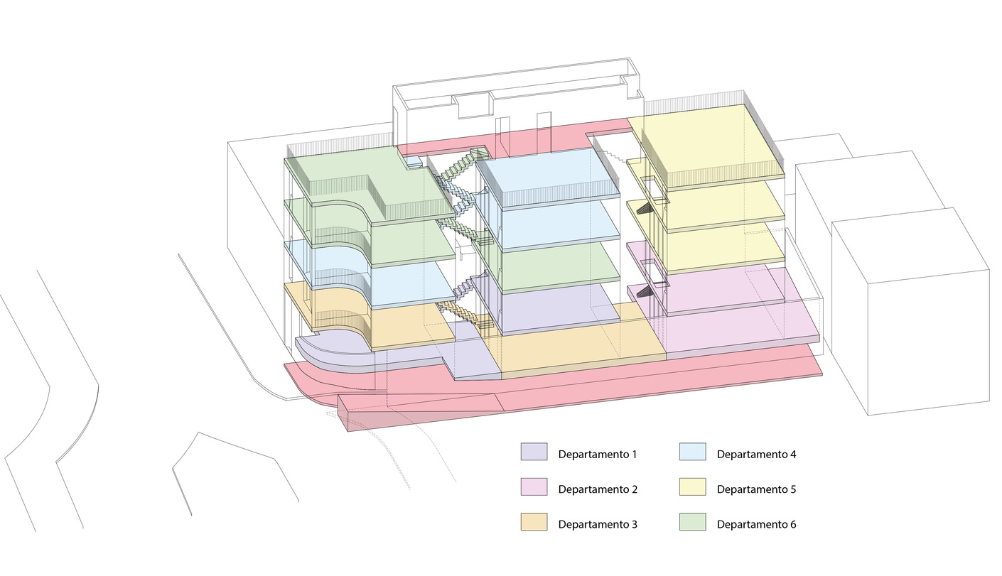 Vier der Apartments befinden sich in den vorderen beiden Gebäudeteilen. Da Héctor Barroso jeder dieser Wohnungen eine Verbindung zur Straße verschaffen wollte, verschachtelte er ihre je zwei Ebenen diagonal mit ihrem jeweils darüber- beziehungsweise darunterliegenden Nachbarn. Somit befindet sich keine der Einheiten gänzlich im Erd- oder Obergeschoss. Beide oberen Apartments profitieren von privaten Dachterrassen, während den unteren Wohnungen die beiden Höfe als Außenfläche zur Verfügung stehen. Am Rand des ersten Patios befindet sich der Treppenaufgang, der die straßenseitigen, öffentlicheren Wohnbereiche mit den privaten Zonen im mittleren Volumen verbindet.