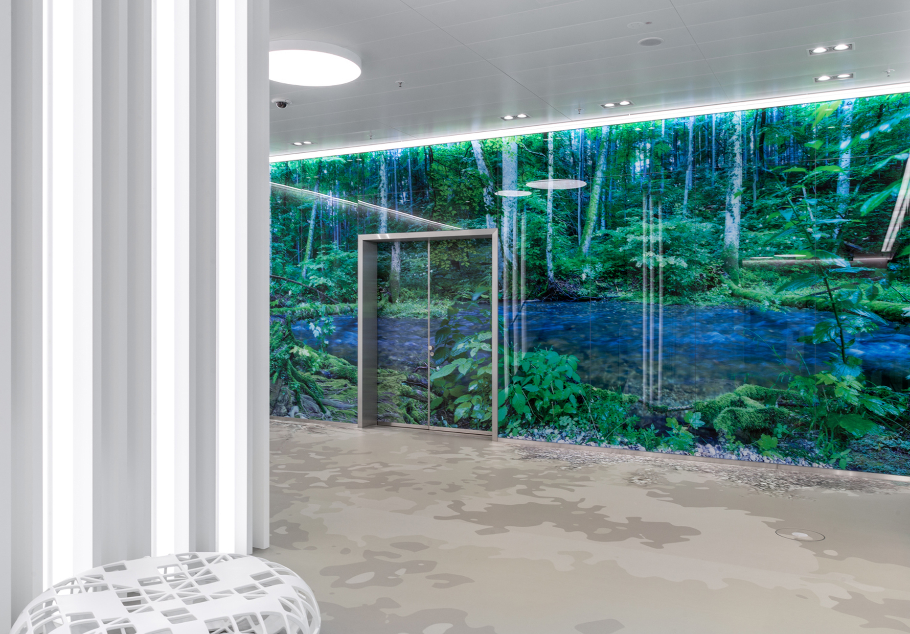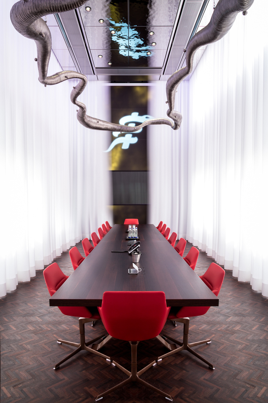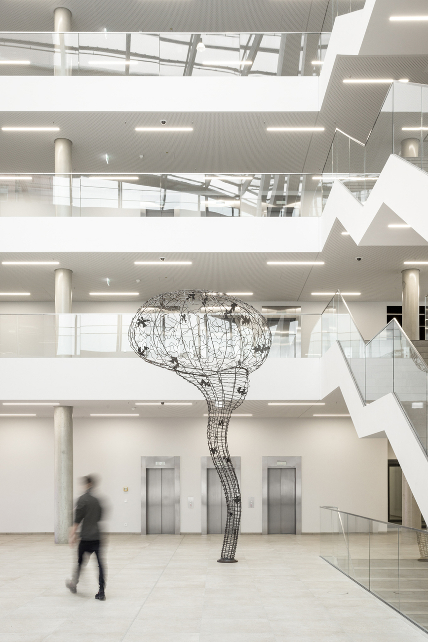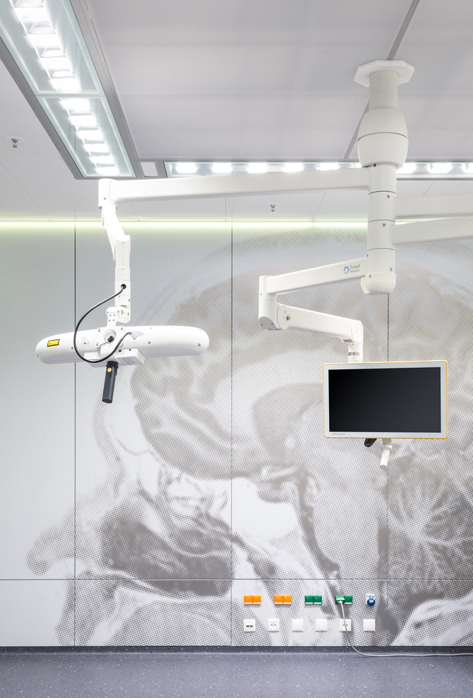 Neben den Klinik- und Büroräumen ist auch ein großes Freizeitangebot für die Brainlab-Mitarbeiter entstanden – inklusive Restaurant, Fitnesscenter und mehreren Aufenthaltsräumen wie einer Lounge im Kopf des Towers. Für die Umsetzung des Innenausbaus fertigte Markus Benesch mit seinem Team viele Wandoberflächen und Böden vorab im Maßstab 1:1 in Musterräumen an, um sie für Brainlab anschaulich werden zu lassen – "das gesamte Gebäude gab es vorab als Ausschnitt", so der Designer. Angesichts der besonderen Ausgangsbedingungen des Gebäudes wurden zudem viele Elemente des Innenausbaus erst während der Realisierung entwickelt, wie z. B. einer automatischen Türsteuerung mit Touchless Sensorik aus Glas oder einer großflächigen Schiebetür mit integrierter Projektionsfläche. "Wir wurden durch Lindner gut unterstützt, das sind ja auch absolute Profis in diesem Bereich", so Markus Benesch.