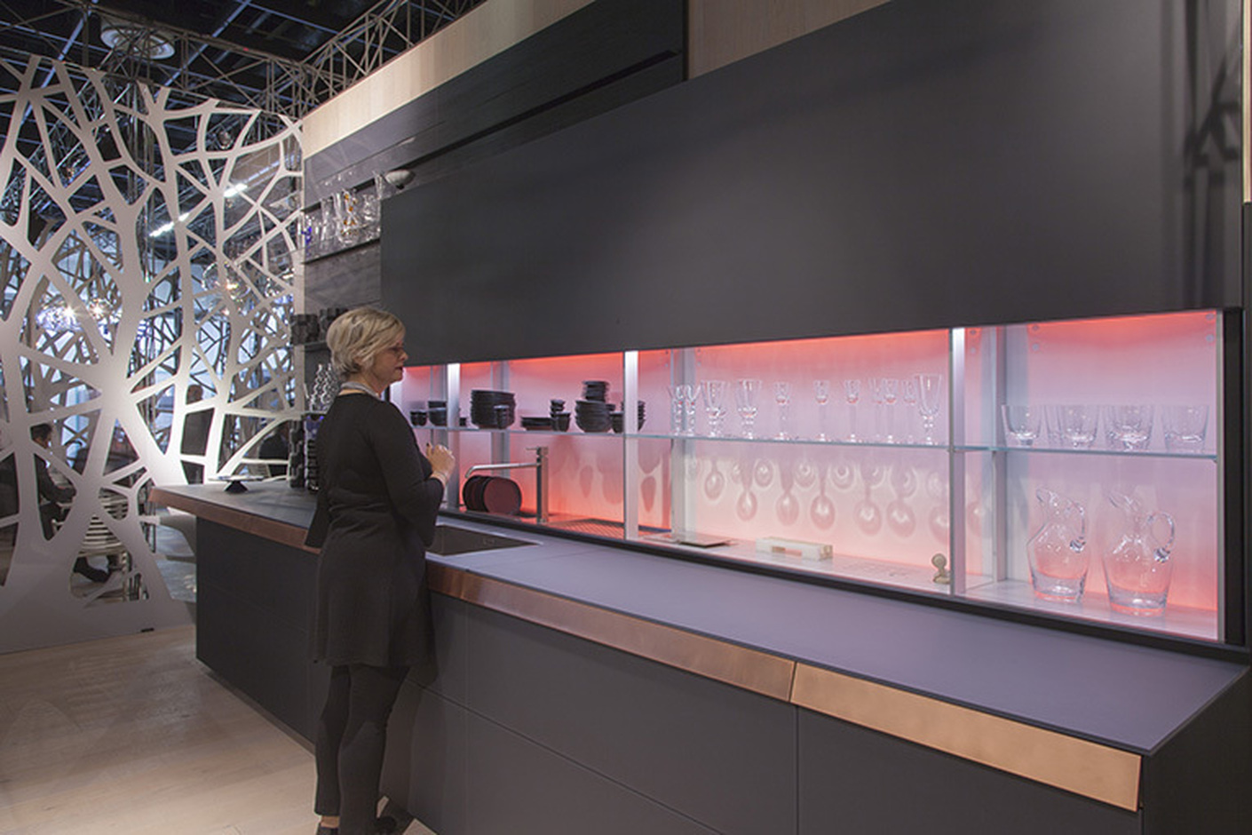 Ein anderes Verständnis des nahtlosen Übergangs zwischen Küche und Wohnraum wird bei Team 7 deutlich. Das österreichische Unternehmen (mit 86 Prozent Exportquote) bietet mit „filigno“ ein neues Massivholz-Programm an, das auf einer eigens entwickelten, nur zwölf Millimeter dünnen Dreischichtplatte mit Schattenfuge und Hirnholzeinleimer basiert. Zusammen mit dem bislang hauptsächlich für Badgestaltung bekannten Designer Dominik Tesseraux aus Potsdam und Team 7-Chefdesigner Sebastian Desch entstanden eine Küche wie auch ein Möbelsortiment mit Anrichte, Highboard und Regalen. Die Korpusse lassen sich ineinander verschachteln, die Kücheninsel bietet zugleich eine hohe Arbeits- und eine niedrigere Speiseebene. Finessen wie beleuchtete Elemente, Glastüren und Böden sowie Keramik-Oberflächen runden das Programm ab.