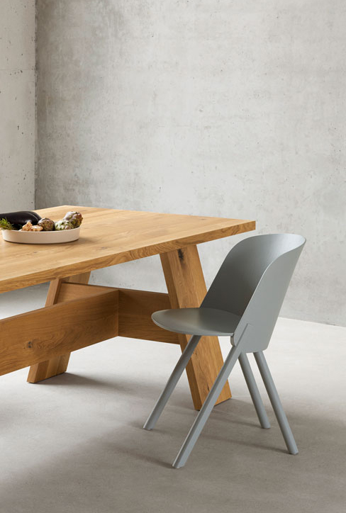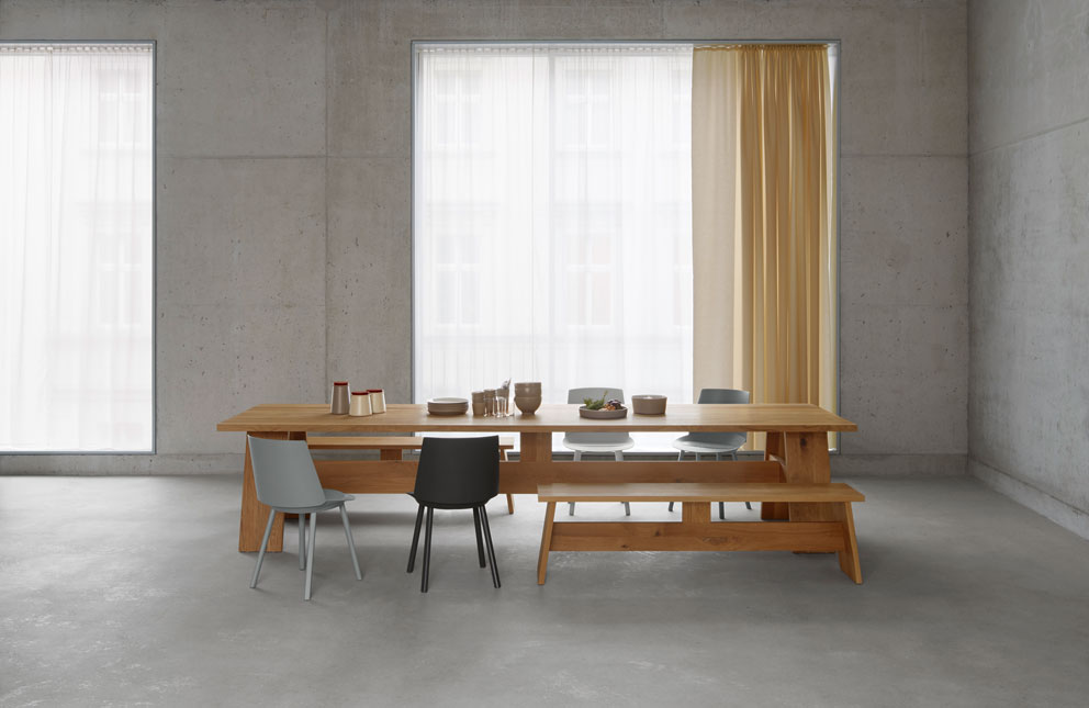 Und dann diese drei Stücke: Keine große Schau, sondern eher ein Grundrauschen. Mit einer Mittelzarge, die sie als Familie kennzeichnet. Mit einem kleinen Überstand von Platte und Sitz. Mit leicht abgeschrägten Beinen, was die Gruppe nicht bloß urban, sondern auch ein wenig ländlich wirken lässt – nebenbei bemerkt ist David Chipperfield auf einem Bauernhof aufgewachsen.