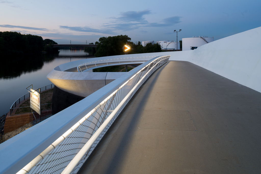 Gerade der letzte Punkt verdient genauere Betrachtung, denn schließlich entstand die Brücke in sicherheitstechnisch anspruchsvollem Gebiet zwischen Flusslauf und hochentzündlichem Material. Obwohl die Nutzer der Brücke dem Tanklager und den Abfüllanlagen nahe kommen, musste gewährleistet sein, dass – sei es durch kriminelle Energie oder ungünstige Windverhältnisse – keine brennenden Gegenstände auf das Gelände gelangen können. Tankschiffe mussten auch in Zukunft außer Reichweite bleiben und ganz nebenbei sollte die Brücke ihre Besucher im Fall etwaiger Unfälle schützen. Vielfache Herausforderungen also, die die Architekten lösten, indem sie die Brüstung von Brücke und Spindel zum Tanklager hin in Form einer knapp drei Meter hohen Sicherheitswand ausbildeten. Zum Main hin öffneten sie das Bauwerk hingegen und ließen durch ein filigranes Geländer aus Edelstahl-Netzgewebe Blickbeziehungen zum Fluss zu. Denn genau wegen diesem kommen schließlich die meisten Besucher.