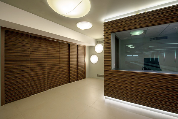 Inmitten des Botschaftsviertels von Athen hat auch die Vertretung der Europäischen Kommission ihren Sitz. Ein Konferenzraum im Untergeschoss des Gebäudes erwies sich als ungünstig geschnitten, zu niedrig und auch die technischen Einrichtungen sollten überarbeitet werden. Die Architektin Maria Paraskevopoulou von mparchitects musste dabei die vorhandene Statik berücksichtigen. Mehrere Betonträger und -stützen ließen den Raum enger und niedriger erscheinen, als er mit 2,60 Meter ohnehin schon ist. Auch zur Verbesserung der Akustik und Beleuchtung entschied sie sich für ein durchgehendes, schräg gestelltes Element aus Grobspanplatten, das die störenden Betonelemente überspielt und einen einheitlichen Raumeindruck schafft. Die Installationen für Klimatisierung und Beleuchtung wurden in diese Holzkonstruktion integriert, so dass in dem fensterlosen Raum gute Arbeitsbedingungen herrschen.