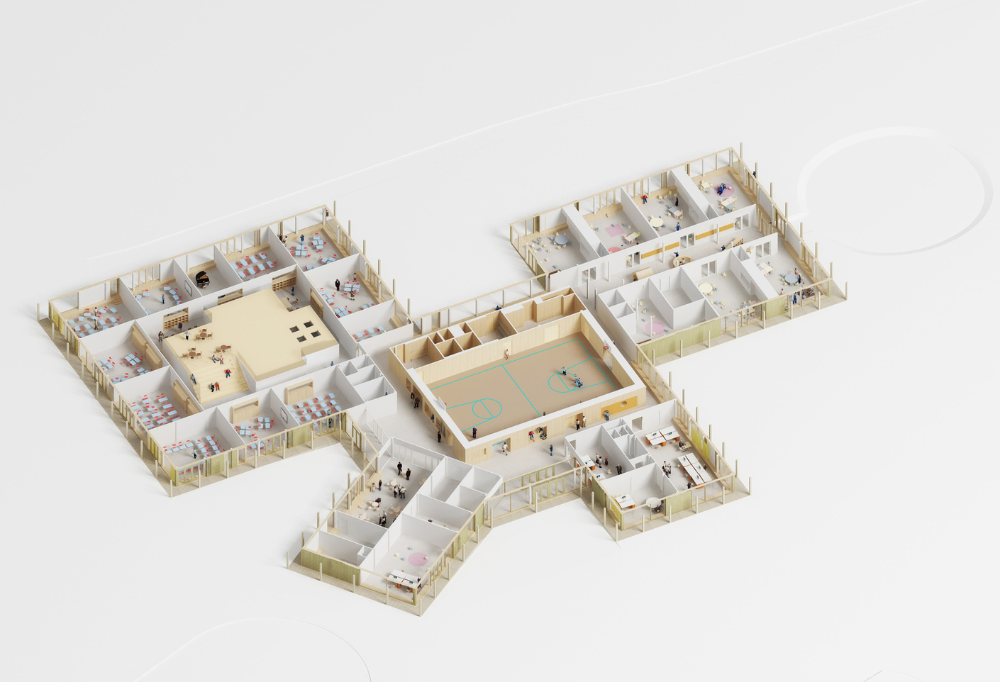 Die Raumorganisation in den Gebäudeflügeln ist aus ihrer jeweiligen Funktion entwickelt: So sind die Klassenzimmer der Grundschule um einen zentralen Platz herum angeordnet, der zum Spielen und Lernen gleichermaßen dient. Zentrales Element ist hier ein großes Podest unterhalb der bereits erwähnten trichterförmigen Dachausstülpung. In seinem Sockel befinden sich Sanitär- und Abstellräume, auf ihm finden Gruppen- und Einzelarbeitsplätze unter einem großen Oberlicht ihren Platz. Hohe Stufen schaffen zudem ein kleines Auditorium. Wie die Multifunktionshalle kann auch das Podest vollständig umrundet werden – so entstehen keine "toten Winkel" und Sackgassen.