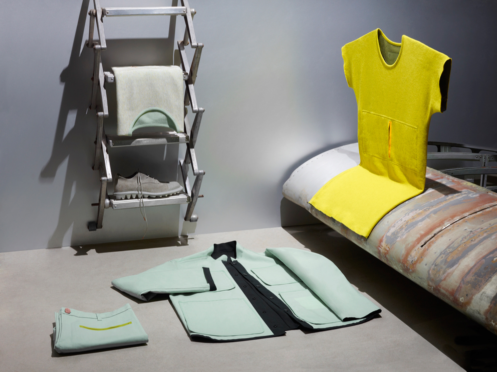 Also gibt es Jacken, Hosen und Overalls, die durch ihre kantigen, geradlinigen Formen, durch ihr stabiles Material und nicht zuletzt durch zurückhaltende Töne wie Grau, Mint und Schlammgrün in Look und Silhouette Industriearbeiter-Uniformen zitieren. Die man aber nach Belieben auf kräftige (Warn-)Farben „umschalten“ kann, denn die Stücke lassen sich alle wenden, von Schlammgrün auf Grellgelb oder von Grau auf Stahlblau. Angesagt ist Multifunktionalität: Jacken, die sich im Handumdrehen in einen Rock oder einen Schlafsack (Parkbank!) verwandeln lassen; Schuhe, die man durch ihre ölig glänzende Patina im ersten Moment bei Greenpeace-Aktivisten verortet – und die dann durch ihre schlichte Machart sowie durch den Stilmix von Desert-Boot mit Running-Schuhsohle verblüffen. All das hat Witz – und macht durchaus Sinn.