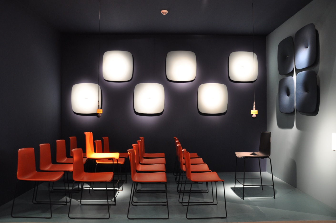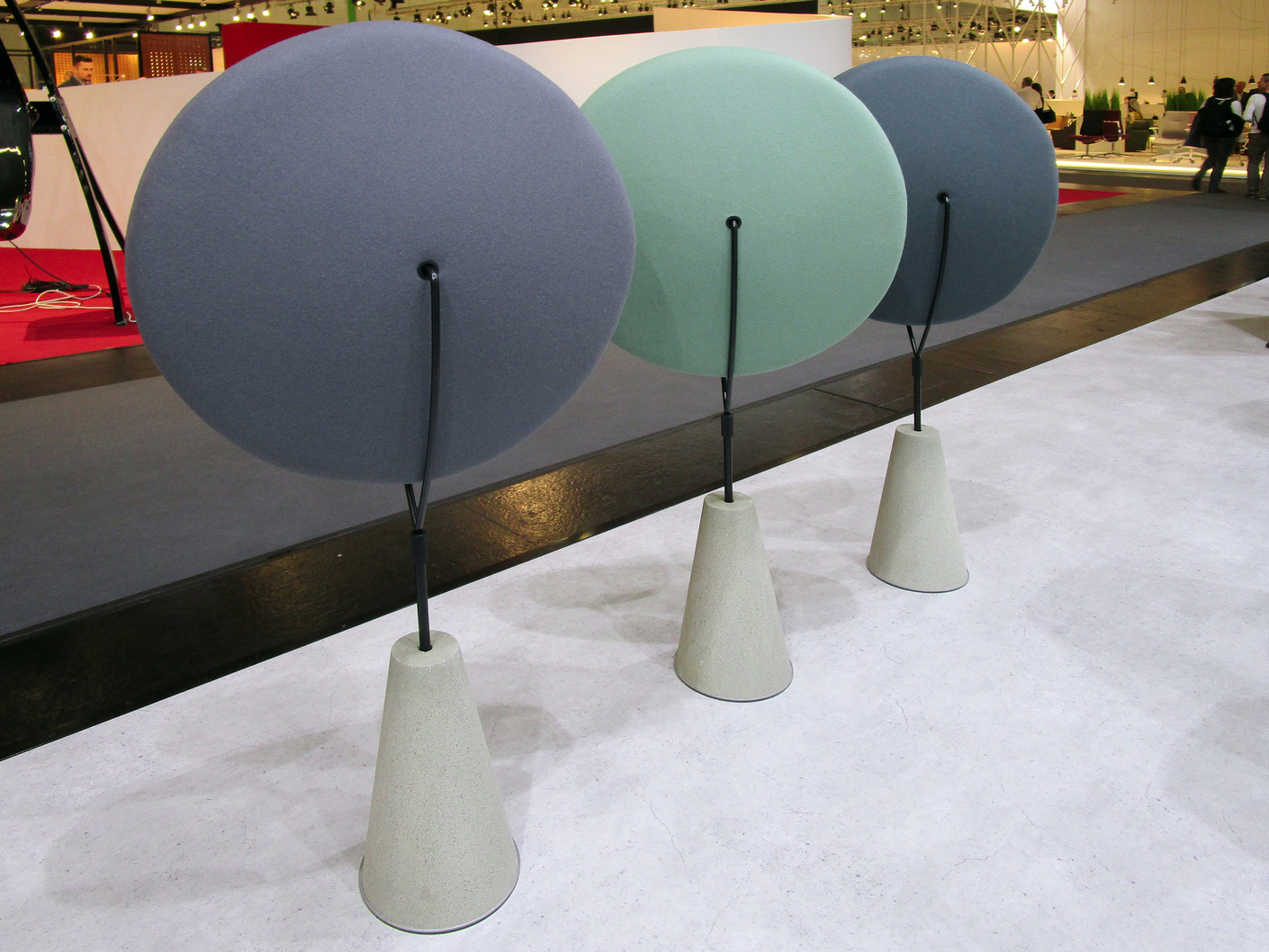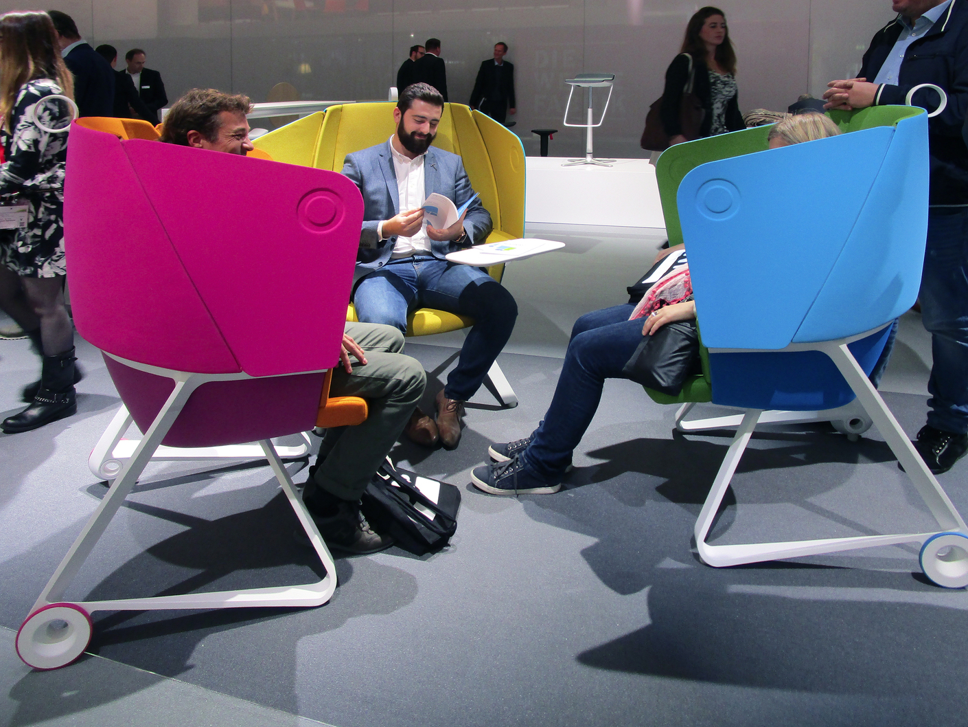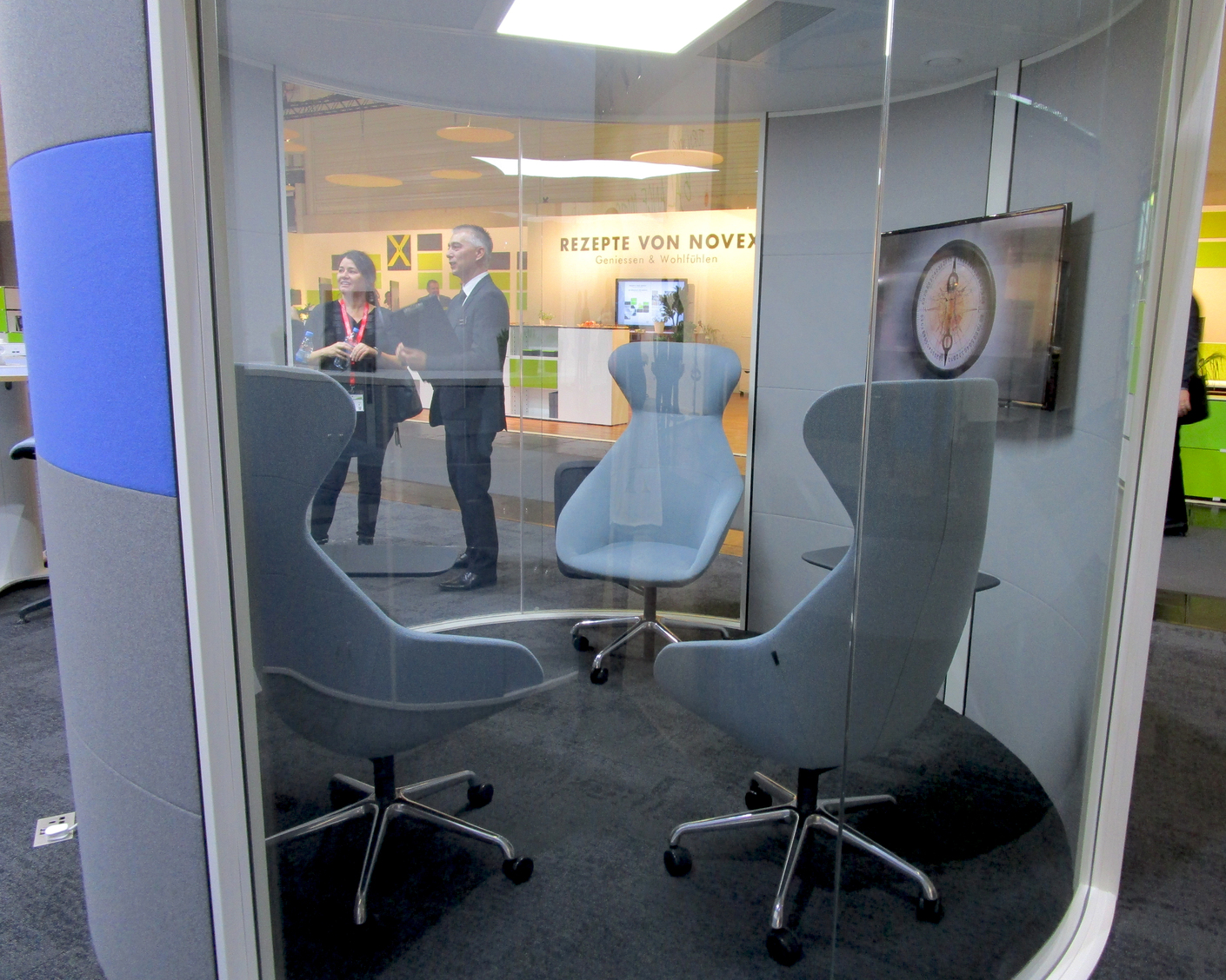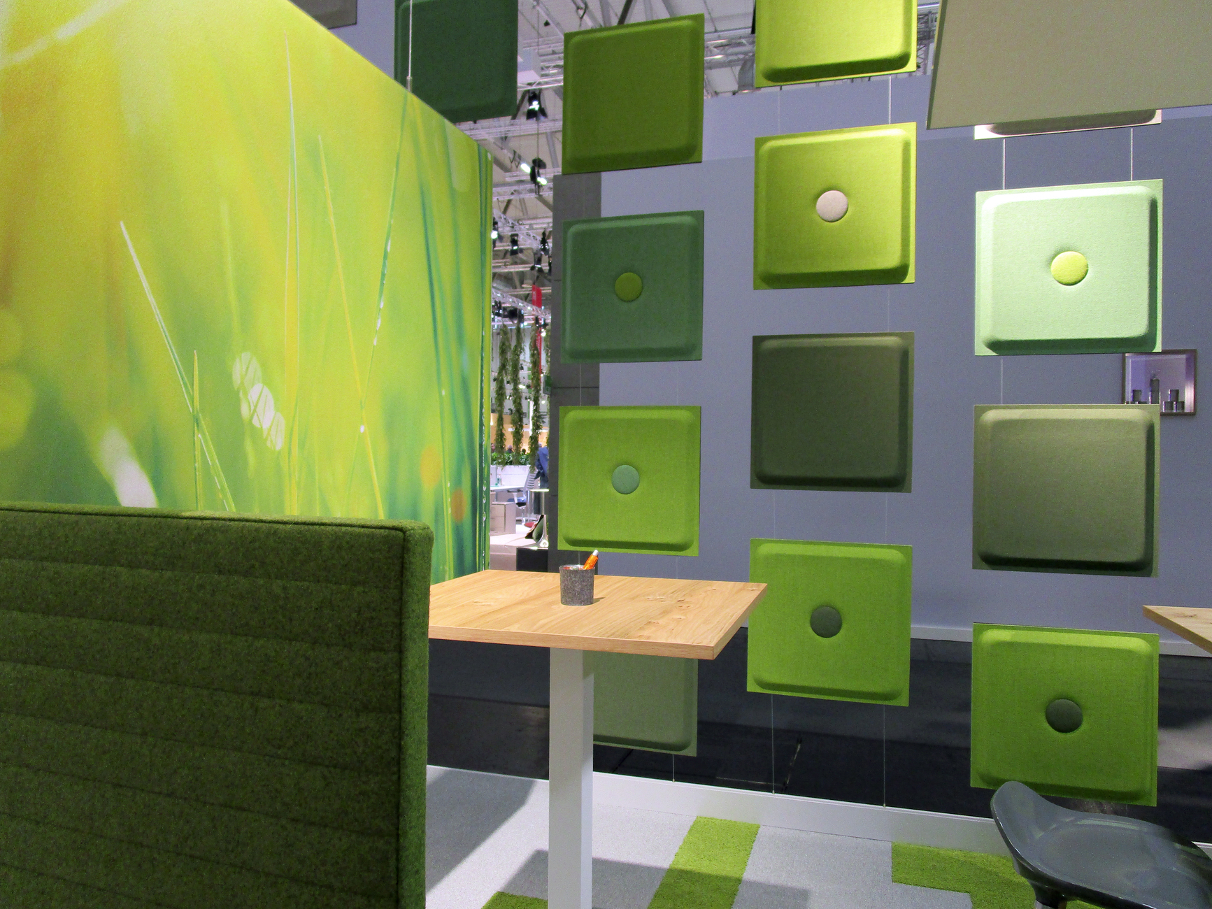 Auf der „internationalen Leitmesse für Office und Objekt“, kurz Orgatec, ist das Schallschutzthema in diesem Jahr omnipräsent. Vor lauter gemütlicher Stofflichkeit und kuscheligen Akustikdämpfern mit Loungecharakter kann man dabei schnell vergessen, dass im Fokus der Messe eigentlich Büromöbel stehen. Die im Januar auf der imm cologne noch so beliebten Pflanzen als Lärmschutz finden sich nur noch vereinzelt – Stoff, Stoff, Stoff heißt die Devise. Rechteckige Tische und geradlinige Schreibtischstühle wirken in der aktuell derart verstofflichten Bürolandschaft da schon beinah fehl am Platz.