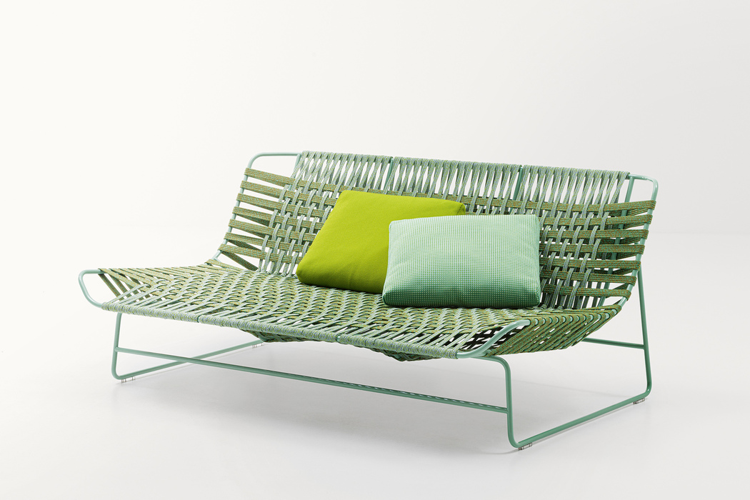Paola Lenti hat die von Lina Obregón entworfene "Telar-Serie" um ein Zweisitzer-Sofa erweitert. Die Serie umfasst dabei auch einen Sessel, einen Stuhl mit oder ohne Armlehnen, eine Chaiselongue, einen Hocker und seit neustem auch eine Sonnenliege mit Kunststoffrädern und einer rollenförmigen Kopfstütze. Das Sofa weist wie die anderen Möbel der Serie ein Gestell aus glänzend lackiertem Edelstahl mit Abstandshaltern aus Kunststoff auf. Für die Polsterung kommt ein Geflecht mit elastischen Gurten aus Rope-Garn in unterschiedlichen Größen zum Einsatz. Das Ergebnis ist ein Möbel dessen Struktur für eine filigrane Eleganz sorgt, die sich problemlos in die unterschiedlichsten Umgebungen einfügt. Dabei funktioniert das neue Zweisitzer-Sofa nicht nur im Außenbereich, sondern auch im Wohnzimmer, da es wie alle Produkte der Serie auch in Innenräumen verwendet werden kann.