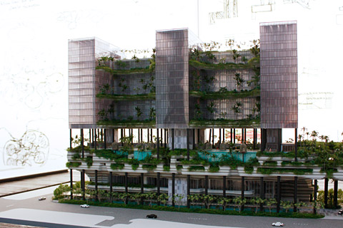 Modell des Hochhauses „Parkroyal on Pickering“: Zwischen seinen Türmen befinden sich „Sky Gardens“ mit Palmen und Frangipani-Sträuchern, Foto © Nina Müller, Stylepark