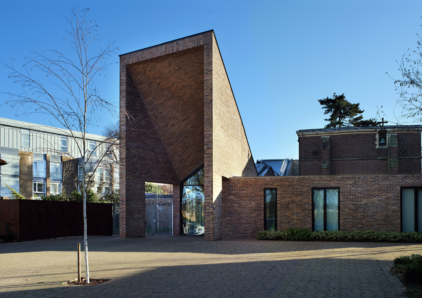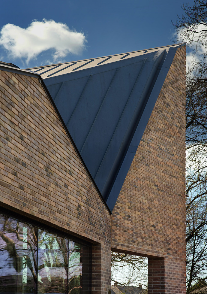 Die gefaltete Dachlandschaft des Erweiterungsbaus nimmt dabei auch Bezug auf die angrenzenden viktorianischen Reihenhäuser mit ihren Satteldächern, Erkern und Ziegelsteinfassaden, wie Stuart Piercy erklärt: "Wir haben das Dach plissiert und gefaltet, um die Dachlandschaft der umliegenden Wohnbebauung aufzugreifen und so die massive Wirkung des Gebäudes auf die Straße zu minimieren. Aber das gefaltete Dach hat auch eine symbolische Bedeutung. Es öffnet sich zum an der Straße liegenden vorderen Gebäudeteil und bildet so einen abstrakten Kirchenturm mit Eingangsbereich aus, der die sakrale Funktion des Gebäudes zum Ausdruck bringt." (ar)