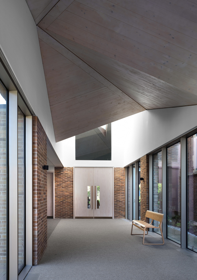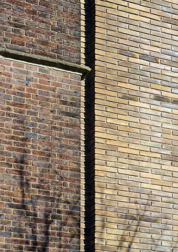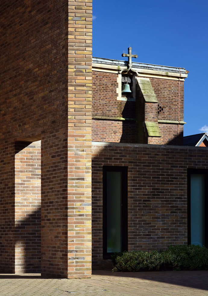 Die ArchitektInnen verfolgten ein Konzept der behutsamen Eingliederung wie Stuart Piercy, Gründer und Geschäftsführer von Piercy&Company, erklärt: "Die alte Kapelle war schon immer mit einem größeren Gebäude verbunden und noch nie von der Straße aus zu sehen. Daher erschien es uns ganz natürlich, die Kapelle wieder in ein größeres Gebäude zu integrieren, in dem sie erneut genutzt werden und zu ihrem Recht kommen konnte." Dafür wurden sämtliche Fassaden der Erweiterung vom Sockel bis zur Traufe mit Ziegelsteinen verkleidet, wobei die ArchitektInnen mit den feinen Nuancen des Materials arbeiteten und besonders darauf achteten, dass die Farbigkeit und Haptik der Steine mit dem Ziegelmauerwerk der alten Kapelle harmonierten. Ausgewählt wurde der Ziegelstein "D46" von Petersen Tegl in einem sanften rotbraunen Zwischenton, der im Innen- und Außenbereich als durchgängiges Fassadenmaterial verbaut ist. "Wir wollten die alte schlichte Backsteinkapelle in einem identischen zurückhaltenden Stil erweitern. Durch den konsequenten Einsatz von Ziegelsteinen konnten wir das Neue mit dem Alten verbinden. Gleichzeitig haben wir das neue Gebäude auch hervorgehoben, sodass es robust und markant wirkt", sagt Stuart Piercy über das Materialkonzept.