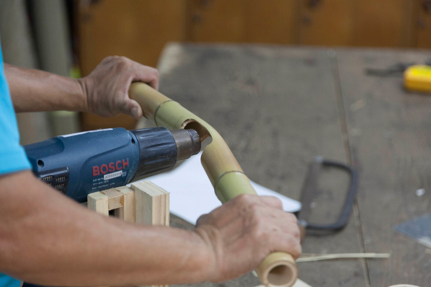 Samy Rio kennt das Tatort-Kommissar-Problem: „Warum ich mich immer wieder mit Bambus beschäftige? Das ist die Frage, die jeder stellt“, sagt er lachend. Aber er hat gute Gründe: „Ich arbeite sehr gerne damit, denn das Material bietet beinahe unendliche Möglichkeiten. Außerdem ist es nachhaltig.“ Wichtig für ihn angesichts der notwendigen ökologischen Wende. Zumal das Potenzial von Bambus nicht annähernd ausgenutzt werde. Die Industrie schneidet und verklebt das Material in der Regel zu Platten, ähnlich dem Sperrholz. Aber das koste viel Energie. Er sieht die Herausforderung deshalb darin, Verwendungsmöglichkeiten für die Röhren als Halbzeug zu entwickeln. Sein Ansatz: industrielle Fertigungsmethoden auf den natürlichen Werkstoff anwenden, um so Plastik oder Metall zu ersetzen. Präzision ist dabei das zentrale Stichwort. Samy Rio bearbeitet Bambusröhren etwa mit einer 5-Achs-CNC-Fräse, um sie zu glätten und die Durchmesser auf ein Maß anzugleichen. So stellt er nicht nur exakte Verbindungen her, wie sie in der Serienproduktion gebraucht werden. Er nimmt dem Süßgras auch seine bisweilen knorrige Öko-Optik.