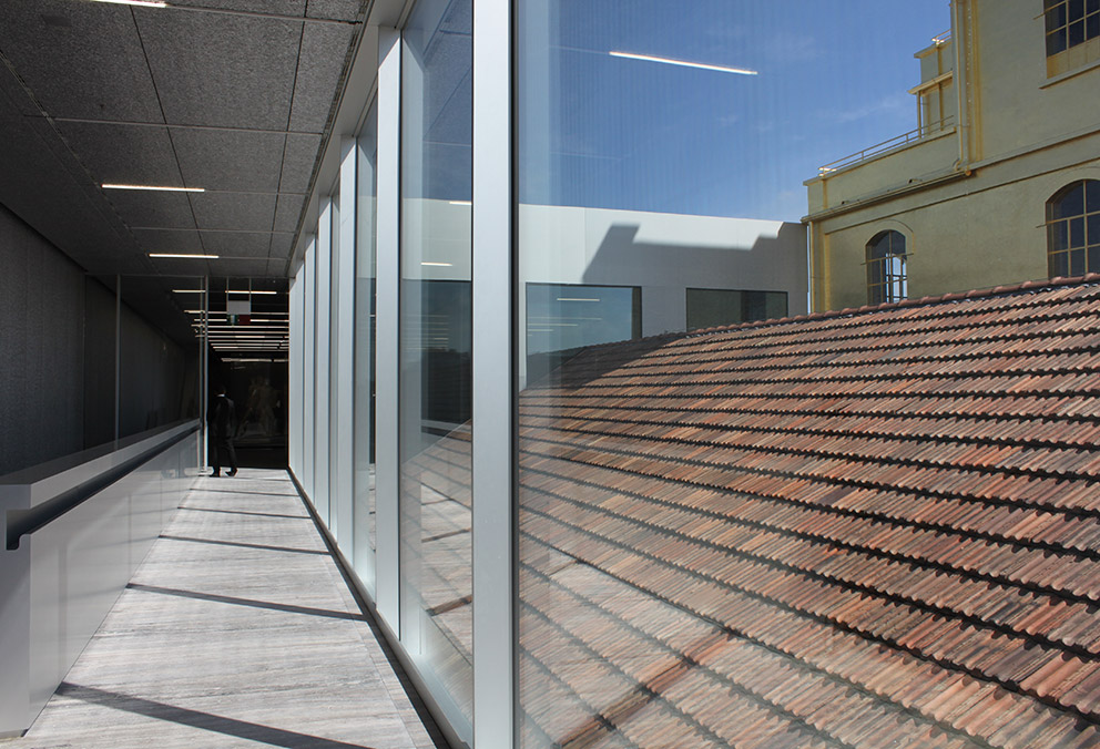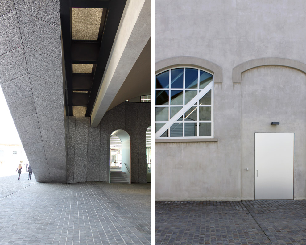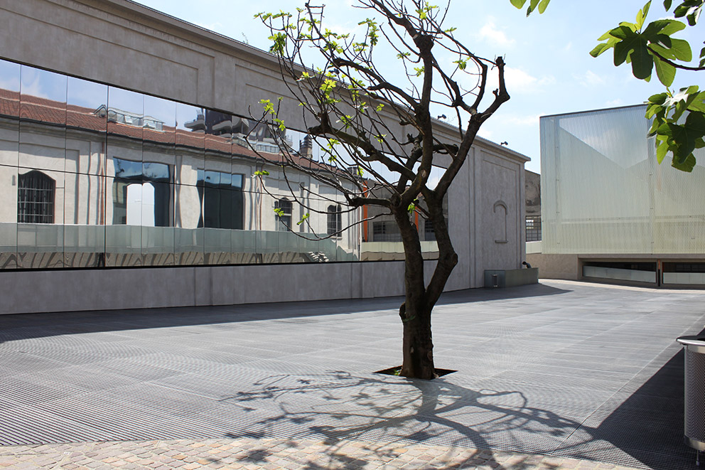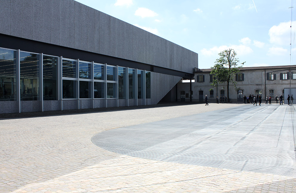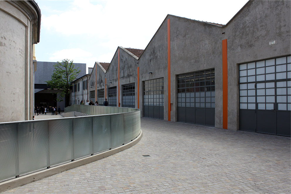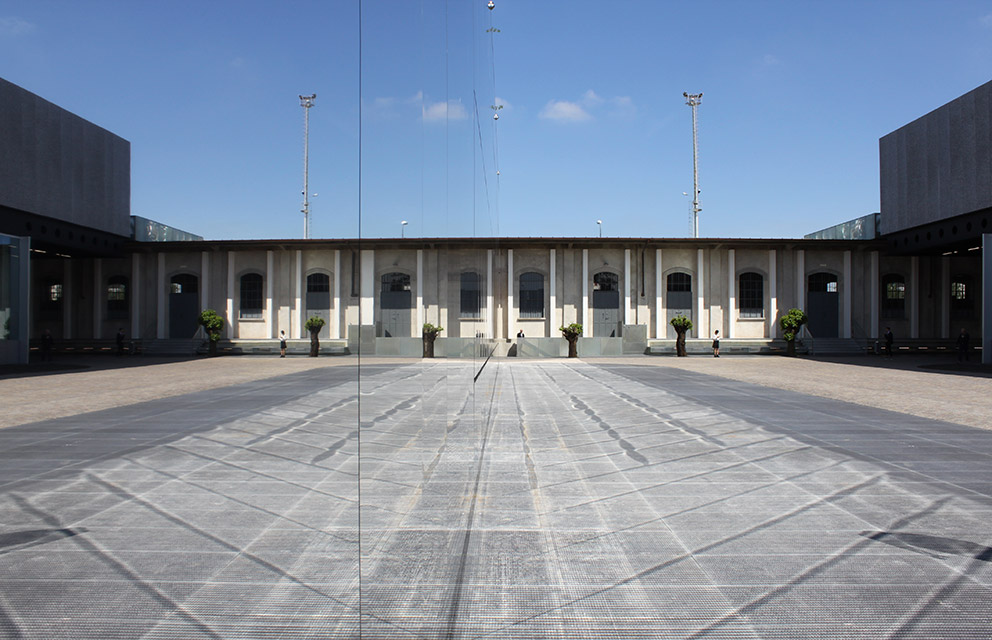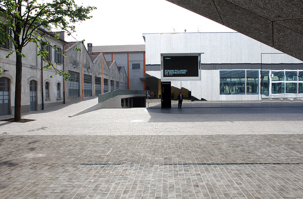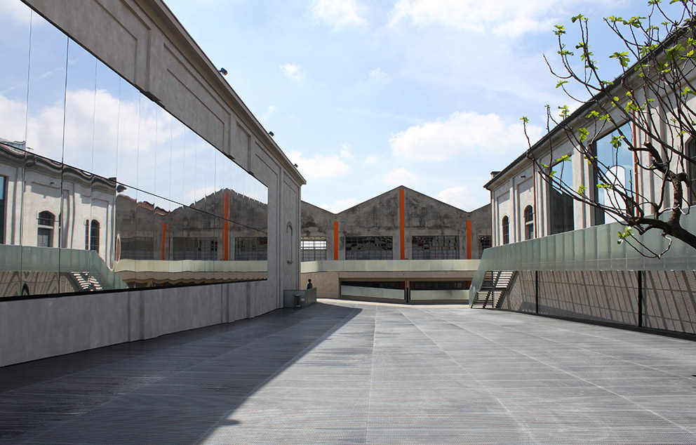 Rem Koolhaas beschreibt die Bauaufgabe als eine klassische Renovierung: „Wir haben den Ort analysiert, und wollten, dass sich Alt und Neu nahtlos zusammenfügen.“ Also fügten die Architekten dem Gelände lediglich zwei (mit dem „Torre“ letztlich drei) neue Bauten hinzu. Der eine ist ein wuchtiger Kubus, verkleidet mit einem Aluminiumschaum, dessen offenporige, korallenartige Struktur träge silbern glänzt. Der andere Bau bildet exakt die Grundform einer Halle nach, die nicht mehr erhalten werden konnte. Er ist vollständig verspiegelt und wirkt deshalb wie eine Fata Morgana. Beide Neubauten wurden nicht einfach plump als Solitäre auf das Gelände gesetzt, um sich selbst zu zelebrieren, sie verbinden sich vielmehr mit dem Bestand, überragen, überschneiden und verschmelzen mit ihm.