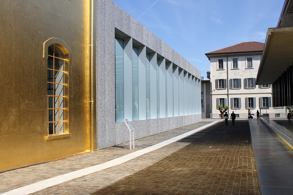 Die neue Fondazione Prada liegt im Mailänder Süden. Das Stadtgebiet besteht überwiegend aus Wohnhäusern, Industriehallen, Autohäusern und einem ausrangierten Bahngelände. Das Areal der Fondazione Prada war ehemals eine Destillerie, mit Bauten, die zum Teil 100 Jahre alt sind und sich wie ein Rahmen um das Gelände legen. Von Außen nimmt man allein das goldene Haus wahr, dessen obere Geschosse lockend über den Bestand herausragen, und einen Teil der silbern glänzenden Fassade eines Neubaus, der sich über den Bestand bis zur Straße hervorschiebt. Seit 2008 hat OMA an dem 19.000 Quadratmeter großen Gelände geplant – allein der Turm („Torre“), ein zehngeschossiges Hochhaus mit weiteren Ausstellungsflächen, befindet sich noch im Bau und soll erst Ende des Jahres fertig werden.