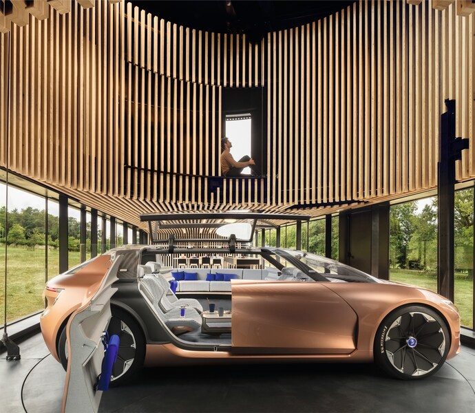 Dennoch – und das ist ein Gestaltungsproblem auf gänzlich anderer Ebene – bildet Renault, was die Überschreitung von Abgaswerten bei Fahrtests unter realitätsnahen Bedingen auf der Straße angeht, keine Ausnahme. Mit einigen Modellen erreicht das Unternehmen sogar negative Spitzmarken beim Überschreiten der Grenzwerte. All dies ist kein Grund, das Renault Designteam davon abzuhalten, über die nicht mehr ganz ferne Zukunft nachzudenken. Neben dem 4,70 Meter langen, nur 1,45 Meter hohen Concept Car, das unter einem nach oben schwenkenden Glasdach und mit an den Fahrzeugkanten angeschlagenen Doppeltüren bequem zu besteigen ist, haben die Gestalter auch noch einen Präsentationsrahmen entwickelt, der in der hintersten Ecke der Halle 8 der IAA zum Anziehungspunkt wurde. Das Haus – ein demontierbarer Stahlskelettbau mit dem Kürzel "H33" benannt – nimmt gestalterische Elemente des Autos auf und umgekehrt, angefangen bei der Außenfarbe Kupfer für das zylinderförmige Obergeschoss bis zu den Details des wohnlichen Interieurs. Das Haus nimmt "Symbioz" als temporären Wohngenossen auf. Autonom und elektrisch fährt das Auto mitten in den Wohnbereich, auf einen Drehteller, wird an vier Stahlseilen nach oben bewegt und fährt – leicht versetzt – auf die Terrasse des Hauses. Man mag all das für Spielerei halten, man mag sogar schmunzelnd an Jacques Tati denken. Und doch demonstrieren die vielen ästhetischen Details, dass die Designer, die hier am Werk waren, keine selbstverliebten Zyniker sind. Man kann optimistisch in Zukunft blicken. Dieses ungewöhnliche Projekt bietet Inspiration, wo andere nur Etüden ihrer gestalterischen Geläufigkeit ablieferten.