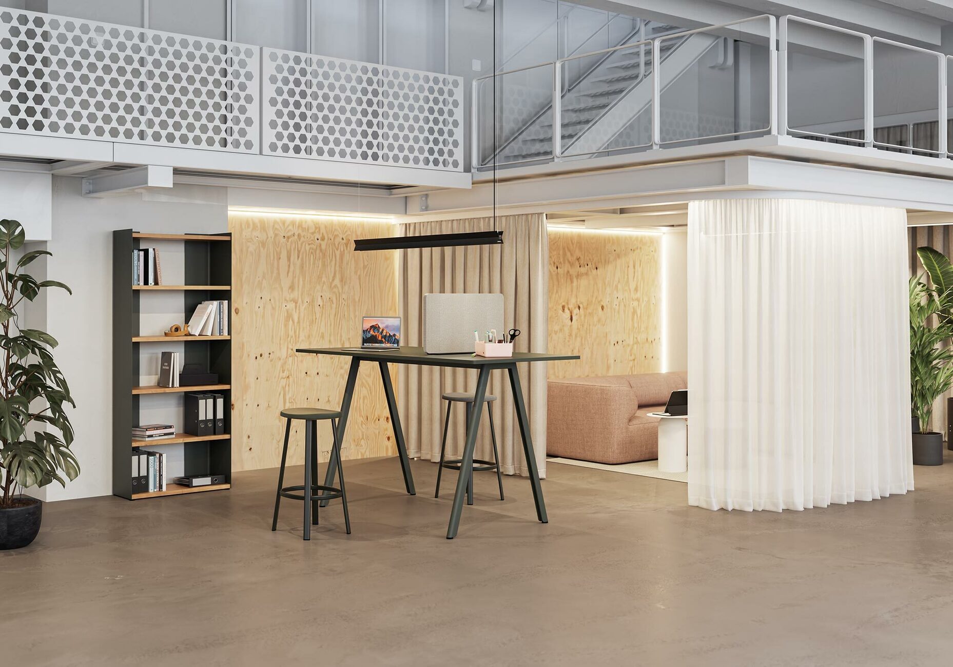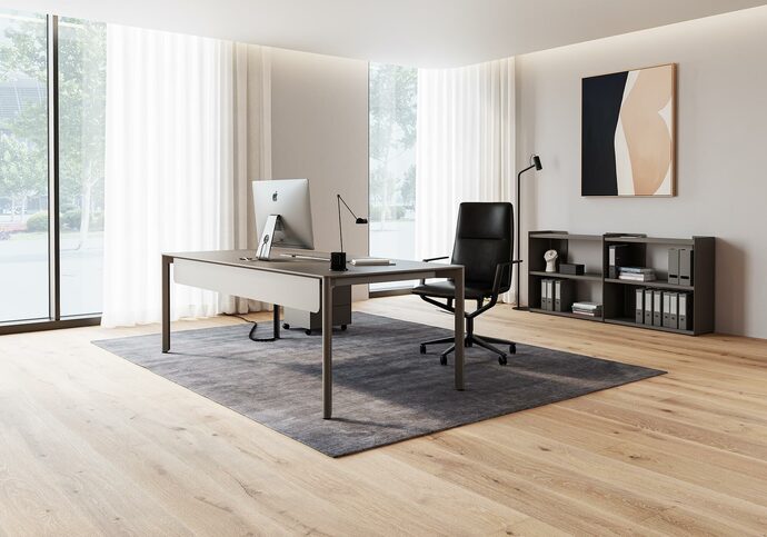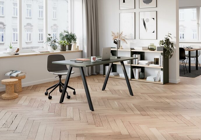 Wandelbarkeit, dafür steht "Slide" von Kaschkasch für Renz wie für die handwerkliche Qualität des Traditionsunternehmens: "In der Manufaktur des Herstellers werden die Tischplatten und Kanten noch von Hand gefinisht, was diesen eine besonders angenehme Haptik verleiht, so Sebastian Schneider. Für "Slide" haben Kaschkasch zusätzlich Massivholz in das Sortiment von Renz mit aufgenommen und entschieden sich bei den Tischplatten für drei Kantenprofile, von gerade über gefast bis zur Massivholz-Profilkante. Für die Farbgebung darf man zwischen Weiß, Steingrau, Schwarz und Piniengrün wählen – neutrale Farben, die das Wohlbefinden bei der Arbeit unterstützen sollen.