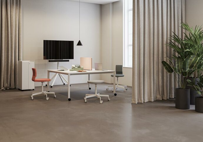 Den runden wie rechteckigen Tischmodellen weisen Kaschkasch dabei keine starre Aufgabe zu, sondern lassen sie flexibel werden – in der Nutzung wie teils auch in der Höhe. "Die Tische sollten nicht zu technisch wirken, sondern leicht und dynamisch, auch wenn die Konstruktion komplex ist", so Sebastian Schneider. Das ist Ihnen gelungen, selbst die vertikale Kabelführung ist dank dem durchgängigen U-Profil der Tischbeine elegant gelöst, zusätzliche Details sind die flexible Kabelverkleidung, Einbaudosen sowie das Kabelnetz an der Tischplattenunterseite. Bodenunebenheiten können indes ganz leicht mit Stellgleitern an den Füßen ausgeglichen werden. Und je nach eigener Präferenz kann zwischen schräg stehenden oder senkrechten Tischbeinen gewählt werden.