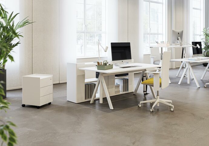 "Wir wollten Produkte entwickeln, die wandelbar sind und in klassischen wie dynamischen Bürowelten eingesetzt werden können", sagt Sebastian Schneider vom Kölner Designduo Kaschkasch. Elegant in der Form, langlebig im Material, flexibel in der Nutzung – viele Ansprüche, die Sebastian Schneider und Florian Kallus in einer facettenreichen Kollektion für Renz vereint haben: "Slide". Tische, die stufenlos verstellbar sind oder mobil auf Rollen eingesetzt werden können, passende Regale, Container und ein Medienelement umfasst "Slide" und bietet so die ästhetische Grundmöblierung einer zeitgemäßen Arbeitsfläche.