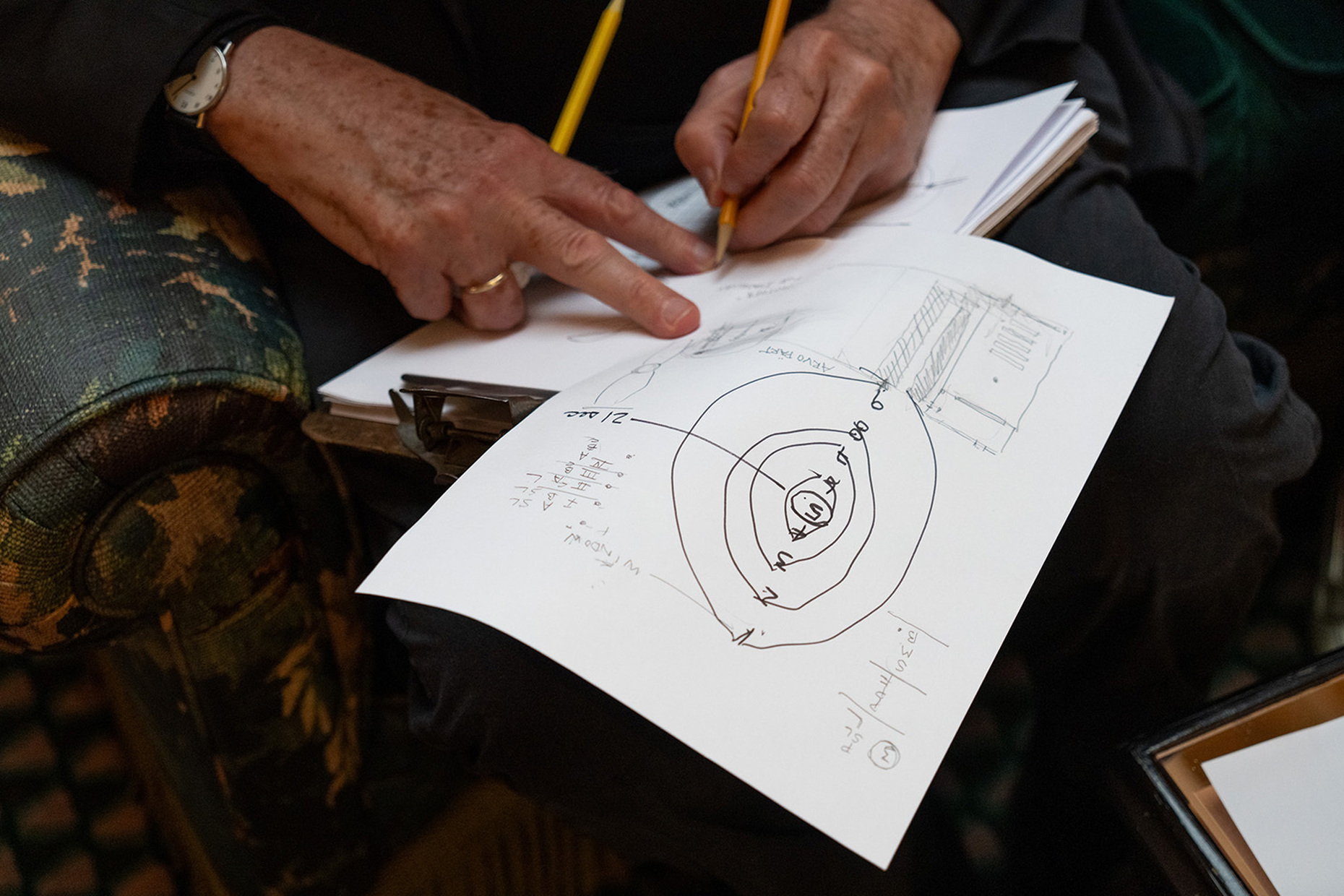 Robert Wilson: Es ist eine Struktur aus Zeit und Raum. Soll es lange dunkel sein oder lange hell, oder ist es eine Mischung aus kaltem und warmem Licht? Kommt das Licht von oben? Von der Seite? Meine Arbeit ist vor allem im Theater bekannt, da sind auch die Stimmen, die Musik wichtig. Wie kann mir das Licht also helfen besser "zu hören"? Schließen Sie die Augen. Sie werden Dinge hören können, die sie zuvor während unseres Gespräches nicht gehört haben.
