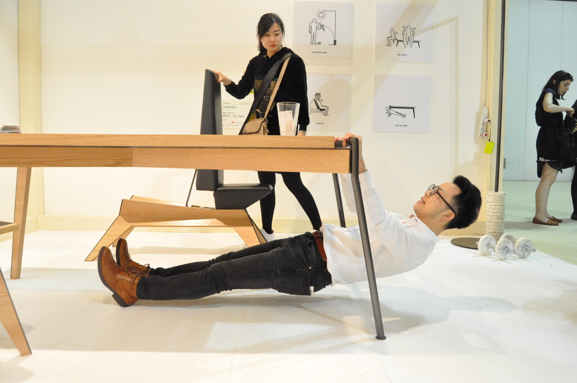 Besonders stark vertreten waren in diesem Jahr junge Talente aus Asien. Allerdings nicht mehr nur vornehmlich aus Japan, sondern auch aus China, Taiwan oder Korea. Dabei konnte man feststellen: Ihre Herangehensweise scheint stärker durch die Traditionen ihrer Kultur geprägt zu sein, als das bei ihren Mitstreitern aus Europa der Fall ist. So lassen Hyung-Moon und Joo-Young Kim aus Seoul althergebrachte koreanische Möbelfertigungstechniken in ihre Projekte einfließen. Herausgekommen ist unter anderem ein schlichter Hocker, der aus drei kleine Massivholz-Platten besteht, die man mittels Nut-und-Feder-Verbindung nur ineinanderstecken muss. Edmond Wong, ein junger Architekt aus Hong Kong, entwickelt Produkte aus eigenen Bedürfnissen heraus. So sind auch seine "Fitnitures" entstanden – Möbel, die eine Fitnessgeräte-Funktion besitzen, dabei aber auch schön anzuschauen sind – etwa eine Stehleuchte mit einem Gymnastikball als Diffusor oder eine Bank, auf der man dank Kopfstütze Sit-ups trainieren kann. Die Idee ist allerdings nicht mehr ganz neu, hat die Industrie dieses Thema doch längst für sich entdeckt, wie man auf der letzten Orgatec sehen konnte.