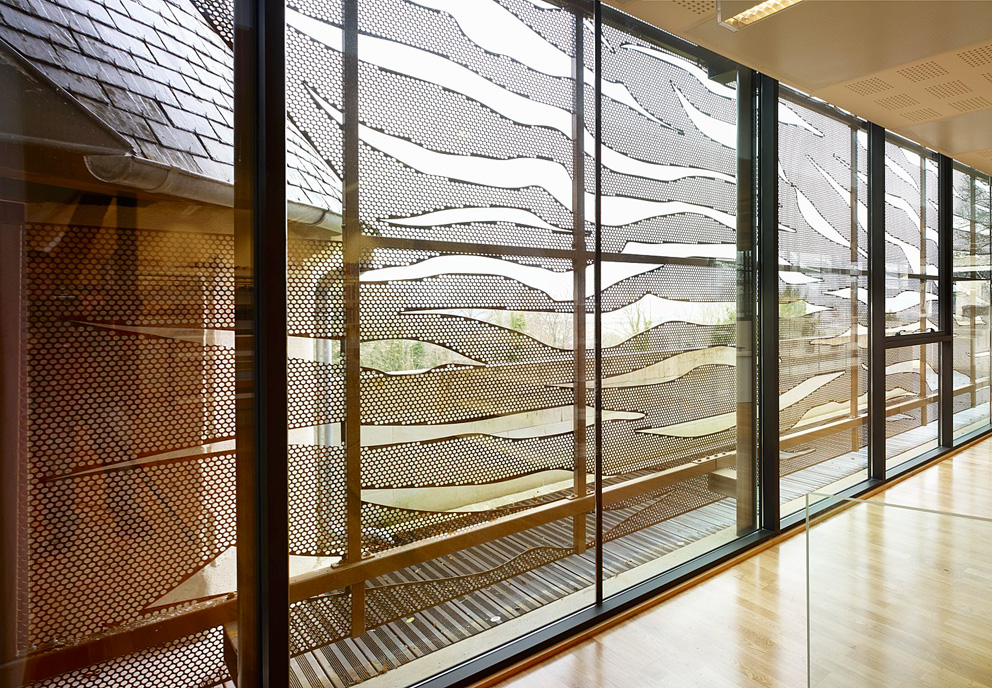 Fünf verschiedene Projekte von renommierten Architekten zeigen: Aus einem notwendigen technischen Detail wie dem Sonnenschutz können ein Gebäude prägende Gestaltungsideen entstehen. Gemeinsam mit den Spezialisten von RMIG entwickelten die Architekten jeweils Lochbleche aus Cortenstahl, Aluminium oder Edelstahl, die – je nach Bauaufgabe – entweder eine spektakuläre bewegliche Fassade entstehen ließen oder einfach ein elegantes, modernes Detail bilden, wie bei der Erweiterung des Château de Cangé. In diesem Fall ergänzte Dominique Blondel den Dachstuhl und fehlende Gebäudeteile eines 750 Jahre alten Schlosses in der Nähe von Tour um gläserne Aufbauten und eine leichtwirkende Hülle aus Cortenstahl. In ihrer Materialität passen die leicht verwitterten Fassadenelemente für eine Bibliothek mit Medienzentrum perfekt zu dem alten Gemäuer, weshalb sich die aktuellen Ergänzungen keineswegs verstecken müssen.