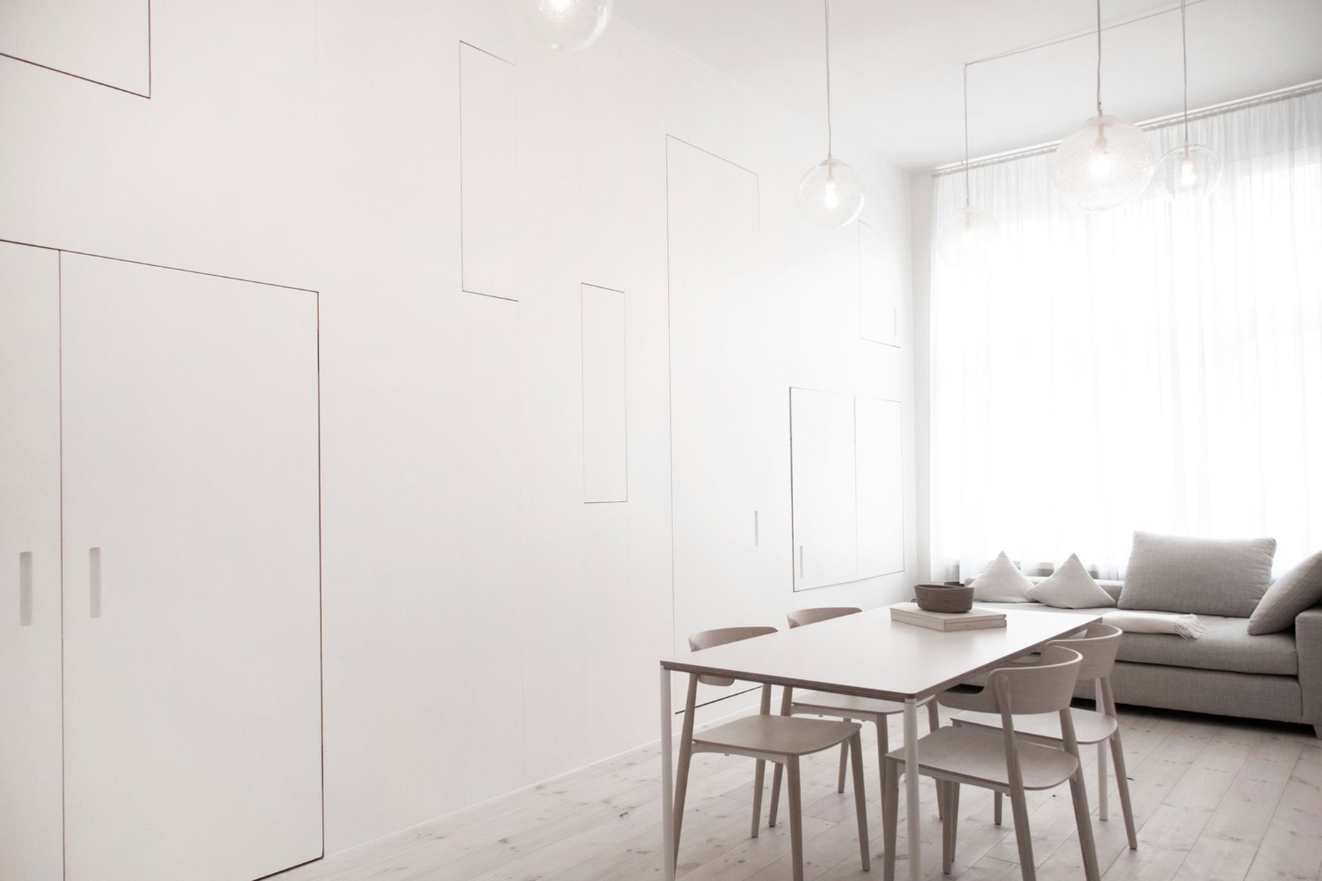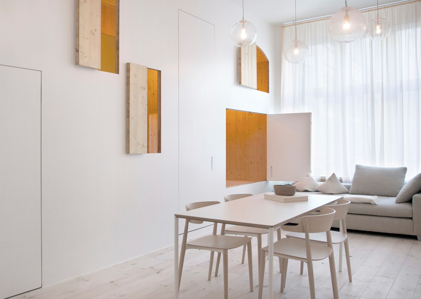 Zentral im Szeneviertel Friedrichshain gelegen, lässt das Hotel Michelberger den Aufenthalt zu einem besonderen Erlebnis werden: Die ehemalige Fabrikhalle wurde vom Designer Werner Aisslinger in ein großzügiges Hotel mit 100 Zimmern, einem Restaurant und Tagungsräumen verwandelt, das eine rohe, kreative Atmosphäre bietet. Zum Konzept des Hotels gehört, dass alljährlich einzelne Räume von interessanten Designern und Architekten umgestaltet werden. Wie beispielsweise von dem dänischen Architekten Sigurd Larsen, der in zwei Zimmern einen doppelstöckigen Wohnkubus eingefügt hat. Da die Bandsysteme eine flächenbündige Raumstruktur von Tür und Wand ermöglichen, ahnt man auf den ersten Blick nicht, welch mannigfaltiges Innenleben sich hinter den Türen auf 50 Quadratmetern verbirgt, wenn alle Öffnungen des Holzhauses geschlossen sind: Ein Schlafzimmer, eine Küche, ein Bad mit Badewanne und eine Sauna finden auf den zwei Stockwerken Platz, die im Kubus über eine Treppe miteinander verbunden sind.