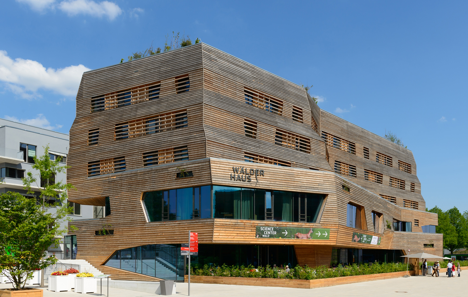 Ein Stück Wald in der Hafenstadt: In Hamburg-Wilhelmsburg dreht sich im Wälderhaus alles um das natürliche Ökosystem. Schon die unregelmäßig verlaufende Fassade aus unbehandeltem Lärchenholz weist auf die thematische Ausrichtung des fünfgeschossigen Baus von Studio Andreas Heller Architects & Designers hin. 2014 wurde der Entwurf mit dem BDA Hamburg ArchitekturPreis ausgezeichnet. Das Angebot des Wälderhauses umfasst eine Dauerausstellung zum Thema Wald, Büro- und Eventräume sowie einen Hotel- und Gastronomiebereich.