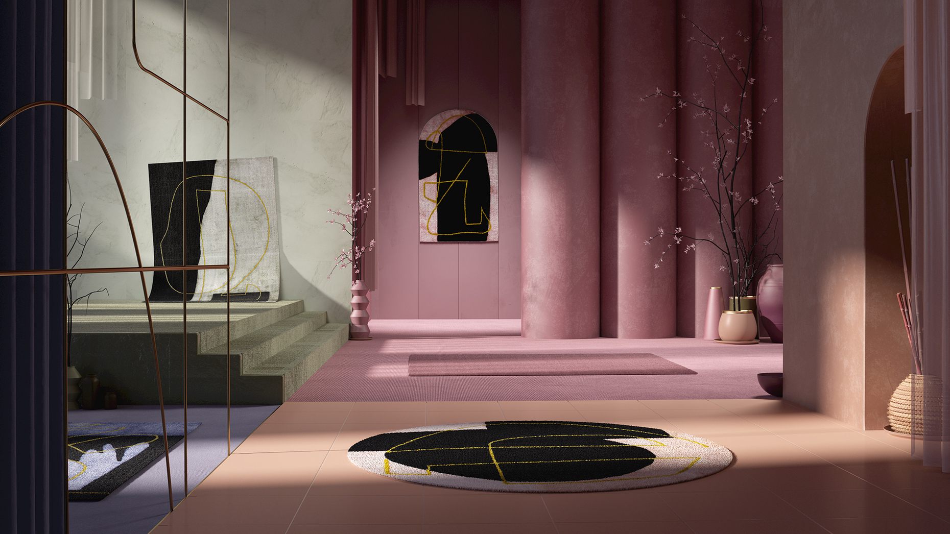 Die Entwürfe von Six N. Five zielen auf Ästhetik – ihre Kulissen sind von einer makellosen, fragilen Schönheit, die sich meist in sanften Farben zeigt: "Pastel Colors sind in der DNA des Studios", so Ezequiel Pini. Die fremde Schönheit, die einen Augenblick in einem Traum festzuhalten scheint, löst ein beruhigendes Wohlgefühl beim Betrachter aus. Das keine Lebewesen in ihren Entwürfen zu sehen sind, lässt dem eigenen Vorstellungsvermögen und der emotionalen Verbindung zu ihren Werken umso mehr Raum: "Wir schaffen Szenerien, die Menschen dazu einladen, mit ihrem Verstand zu navigieren, sie zu erforschen und mit ihrer Fantasie zu füllen", so Pini. Alltagsobjekte, wie ein Stuhl oder ein Bett, regen dabei unsere kognitive Fähigkeit der Wiedererkennung an und geben dem digitalen Bild eine reale Größe. Wie nahtlos die digitalen Zwillinge realer Objekte mit den künstlichen Welten von Six N. Five verschmelzen können, zeigen ihre Arbeiten für Großkonzerne wie Rimowa, Samsung, Laufen oder Nike: Vom Koffer über den Turnschuh bis zur die Sanitärkeramik betten Six N. Five die Produkte so homogen in den digitalen Flow ein, dass man im Ergebnis kaum noch wahrnimmt, dass es sich um Werbung handelt. Den kreativen Prozess starten Ezequiel Pini und sein Team ohne Trockenübung direkt am Computer: "Zuerst fertigen wir eine grobe Illustration mit geometrischen Elementen an, die wir dann Schicht für Schicht perfektionieren, bis zum Hinzufügen von Schatten und Staub", erklärt der Grafikdesigner. Und fügt an: "Die Darstellung in 3D gibt uns nicht nur die Möglichkeit die Traumbilder festzuhalten und zu wiederholen, sondern sie zu perfektionieren."