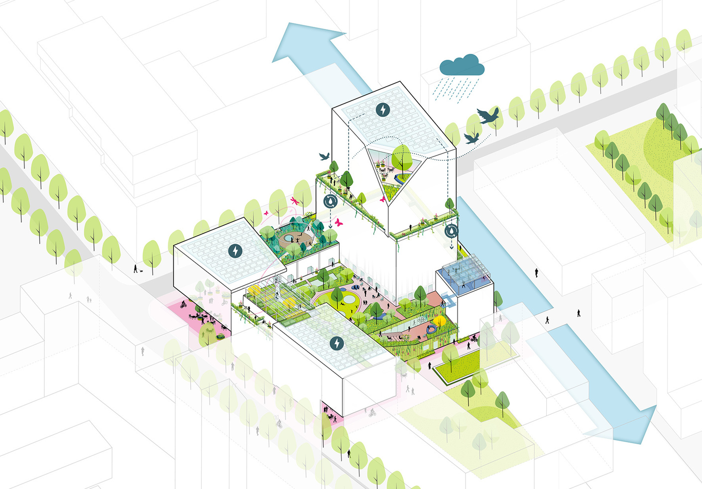 Patchwork soll ein Gebäudeblock mit gut 19.000 Quadratmetern Nutzfläche werden, in der Hauptsache Wohnungen, aber im Sockel und entlang den umliegenden Straßen auch Geschäfts- und Büroflächen. Im Zentrum des Blocks entsteht ein Innenhof als lebendiges, halböffentliches Zentrum mit einem großen Fahrradparkhaus und einem Supermarkt. Auch kleine Geschäfte wie eine Bäckerei, ein Cafe oder Bistro, und ein Fitness-Center sollen entstehen. Ein System von breiten Freitreppen führt zu einem zentralen Dachgarten im Innenhof, der öffentlich zugänglich sein wird. Hinzu kommen fünf weitere Dachgärten, die nur den Mietern und Bewohnern des Blocks offen sein und teilweise untereinander verbunden sind. Ihre Namen verweisen auf die angedachten Programme: Yoga-Garten, Picknick-Garten, Sport-Garten, Meeting-Garten. Die Gärten sollen die Wohnqualität erhöhen, den sozialen Kontakt mit der neuen Nachbarschaft stärken, gegen Hitze und Starkregen helfen sowie trotz des Bauvolumens die Biodiversität unterstützen, auch mittels eingeplanten Nistplätzen und Bienenkörben.