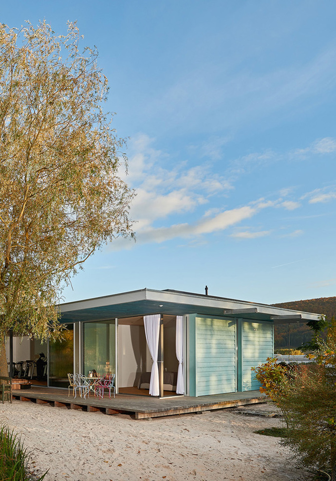 Wie integriert man einen Flachbau behutsam in eine malerische Schilflandschaft? Vor dieser Frage stand das Architekturbüro Markus Uhrig bei dem Entwurf eines Nebengebäudes auf einem Seegrundstück. Ihre Lösung für den Bungalow im oberbayerischen Schongau mit gut 100 Quadratmeter Nutzfläche lag in der Materialwahl: Holz und Glas schaffen fließende Verbindungen zwischen Außen und Innen. Der rund um das Gebäude angelegte Steg geht so optisch in den Holzfußboden des Innenraums über. Da auch die Decke des Raums und der großzügige Dachüberstand mit hellem Holz verkleidet wurden, bietet der Bau eine wohnliche Atmosphäre und fügt sich ganz natürlich in die Umgebung ein.