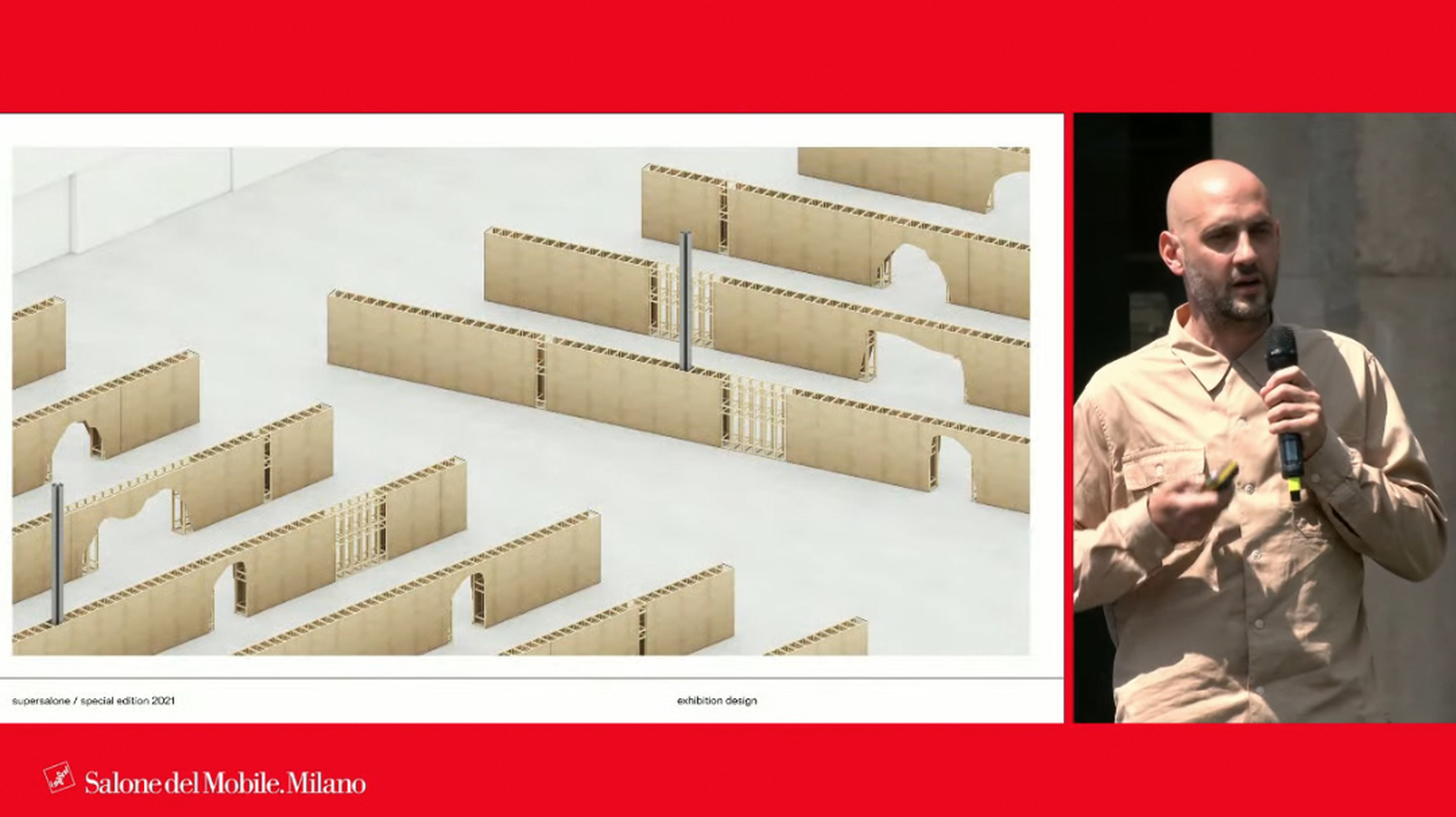 Der Architekt Andrea Caputo hat so für den "supersalone" eine weiterverwertbare Struktur aus Holz entworfen, die auf dem Mailänder Messegelände wie eine große Design-Bibliothek gleichermaßen die Laufwege der BesucherInnen leiten wird, wie den Herstellern die Möglichkeit zur Produktpräsentation bieten soll: Statt wie bisher gewohnt auf einer Fläche zu Wohnwelten arrangiert, werden die einzelnen Neuheiten an den Wänden flexibel hängend präsentiert. QR-Codes sollen Links zu weiterführenden Informationen, wie zu individuellen Angeboten bieten. Der "supersalone" wird im Veranstaltungszeitraum 5. bis 10. September 2021 auch für den Publikumsverkehr geöffnet sein, um kaufinteressierten EndverbraucherInnen die Möglichkeit zu geben, sich über die Produktneuheiten der letzten 18 Monate umfassend zu informieren und über die Kontaktoption mit den Herstellern direkt in Verbindung zu treten. Zum "supersalone" sind zudem weiterführende Kulturangebote geplant, die sowohl die aktuellen Entwicklungen im Design, wie Präsentationen zur Designgeschichte abbilden sollen und als Treffpunkt dienen werden – wie in Form von großzügigen Lounges, Rundgängen und Livemusik-Events. Ebenso werden Arbeiten von NachwuchsdesignerInnen zu sehen sein. Schon der Auftakt zum Messegelände setzt einen grünen Schwerpunkt: Als Part des städtischen Aufforstungsprojekts Forestami sind für die Begrünung des Empfangsbereichs der Messe am Osttor 200 Bäume vorgesehen, die im Anschluss an die Veranstaltung im Mailänder Stadtgebiet eingepflanzt werden.
