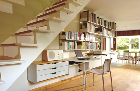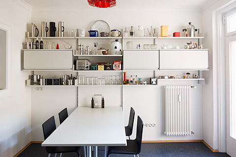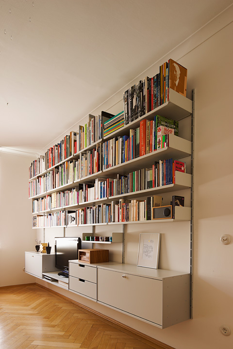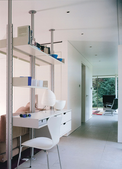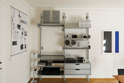 E-Profile, pulverbeschichtete Tablare aus gefaltetem Blech – in zwei Breiten und vier Tiefen: Die Module des „606" sind überschaubar und bieten unzählige funktionale Variationen – als Wandregal und Raumteiler, CD-Board oder Schrank. Schon im Flur in der Sendlinger Straße, zu Hause bei Monika und Michael, fällt der Blick als erstes auf ein grauweißes Wandregal mit Schubladen und Kästen – eine Art „Side-Board" würde man heute in Möbelkatalogen vielleicht sagen –, auf dem an zentraler Stelle ein „Schneewittchensarg" steht. Die Garderobe besteht aus einem Regalsystem „606" mit Kleiderstange und Hutablage. Der Wandteiler im Flur ist ein raumhohes „606" mit CDs, diesmal als freistehende Variante. Im Bad sind Handtücher und Waschutensilien hinter den Klappen und Kästen eines schwarzen „606" versteckt. Geschirr und Gläser in der Küche stehen auf grauweißen Tablaren, und die Küchenschränke selbst sind natürlich auch ein „606". Im Schlafzimmer wird das Regalsystem zum offenen Kleiderschrank, im Büro verschwinden die typischen E-Profile für die Wandmontage hinter langen Bücherreihen, aus denen zwei Schreibtische hervorragen. An ihnen arbeiten Michael Haberbosch und Monika Hary als Berater für Vitsœ – sie erläutern den Kunden die vielen Möglichkeiten des Regals.