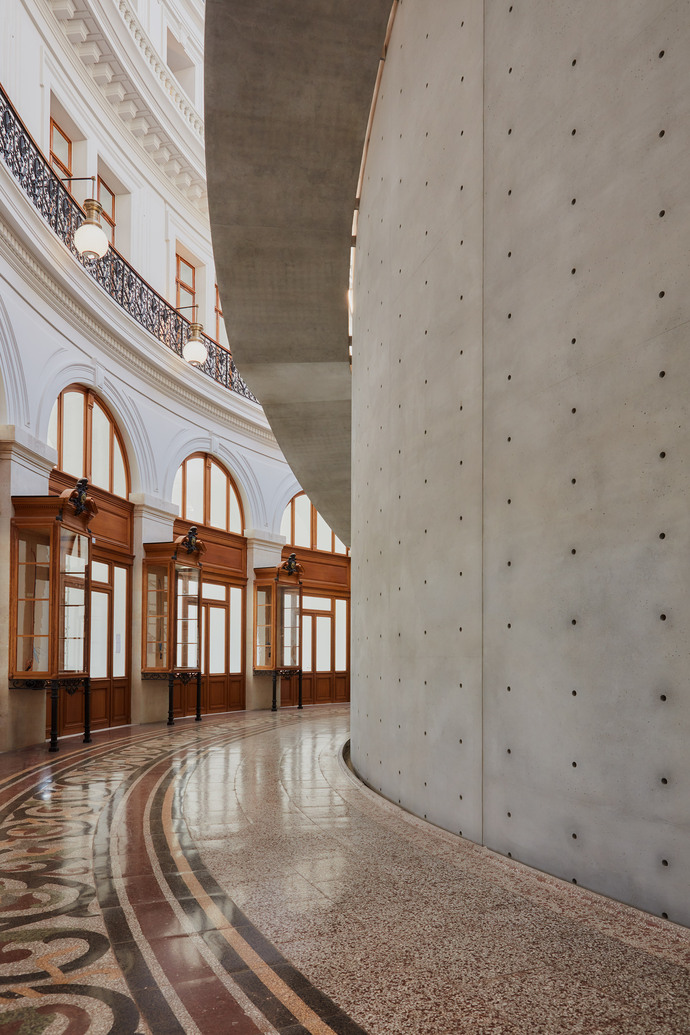Der Sichtbeton-Zylinder ergänzt mit einem Durchmesser von 29 Metern den Raum unterhalb der historischen Glaskuppel und dem Decken-Fresko aus dem 19. Jahrhundert, für das Künstler ein Panorama des Handels gemalt haben. Die fünf Meter breite Fuge zwischen der Betonwand und Bestand bildet die sogenannte "Passage". Als vertikales Element verbindet der Zylinder das zweite Untergeschoss bis zur dritten Ebene und findet einen Abschluss als offene Rundgang-Plattform in neun Metern Höhe, die den Besuchern ermöglicht, die denkmalgeschützte Deckenmalerei aus der Nähe zu betrachten und in ihren Einzelheiten zu entdecken. Die formale Reduktion auf einfache Geometrien wie Quader, Zylinder und Kreise findet ihren Ursprung in der Frühmoderne. Tadao Andos Vorliebe für den Baustoff Beton geht auf das Werk von Le Corbusier zurück, den der japanische Architekt von Beginn an verehrt. Insofern verbindet der zentralsymmetrische Zylindereinbau nicht nur innerhalb der Rotunde die oberen mit den unteren Etagen sowie zeitlich betrachtet das Gestern, heute und morgen, sondern verknüpft auch eine klassische Bauform mit dem Baustoff der Moderne. Weil der Sichtbeton in Situ als Wandelement gegossen wurde (die Konstruktion besteht aus Metallrahmen mit einem hohlen Kern), kann Andos Einbau aus dem Baudenkmal auch wieder demontiert werden. Der selbstbewusste Bestandseingriff ist also behutsamer als auf den ersten Blick anzunehmen wäre und nach den Grundprinzipien der Charta von Venedig aus dem Jahr 1964 konzipiert, der zentralen Richtlinie in der Denkmalpflege. Demnach müssen sich ersetzende Elemente "dem Ganzen harmonisch einfügen und vom Originalbestand unterscheidbar sein, damit die Restaurierung den Wert des Denkmals als Kunst und Geschichtsdokument nicht verfälscht".