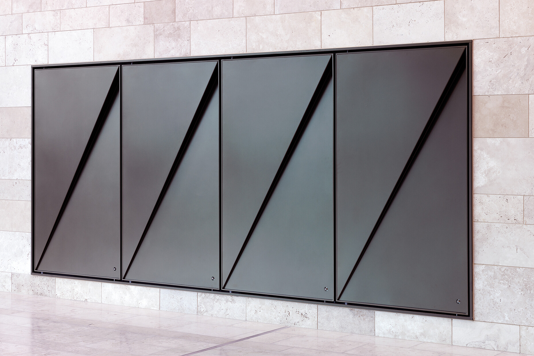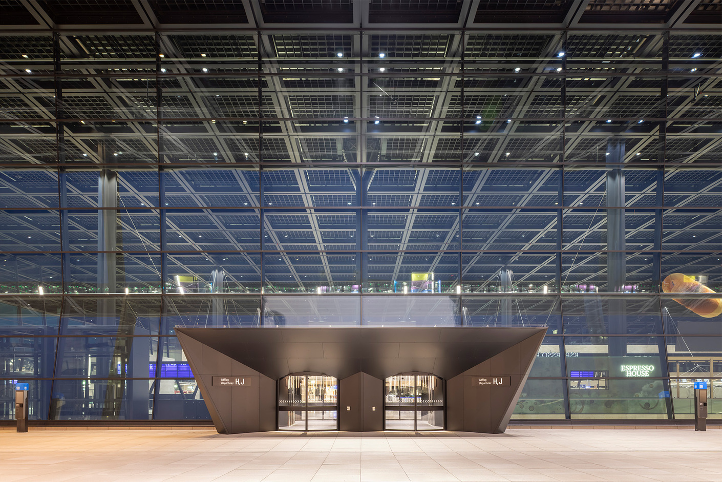 Oberhalb der Piers nimmt je eine Stahlbrücke alle technischen Infrastrukturen auf, sodass diese bei Bedarf ausgetauscht werden können, ohne die Abläufe im Innern zu stören. Überall im Gebäude finden sich zudem massive Stahlschranktüren in den Wänden. Diese, typisch für Mäckler, diagonal geteilten Elemente, sind eigentlich Retentionsklappen, und machen die Haustechnik im Fall der Fälle zugänglich. Auch die Wege sind logisch organisiert: Im zweigeschossigen Pier werden die Nicht-Schengenraum-Flüge ohne Wegekollisionen souverän aneinander vorbei geleitet, der andere, eingeschossige Pier nimmt die Gates für die Destinationen im Schengenraum auf.