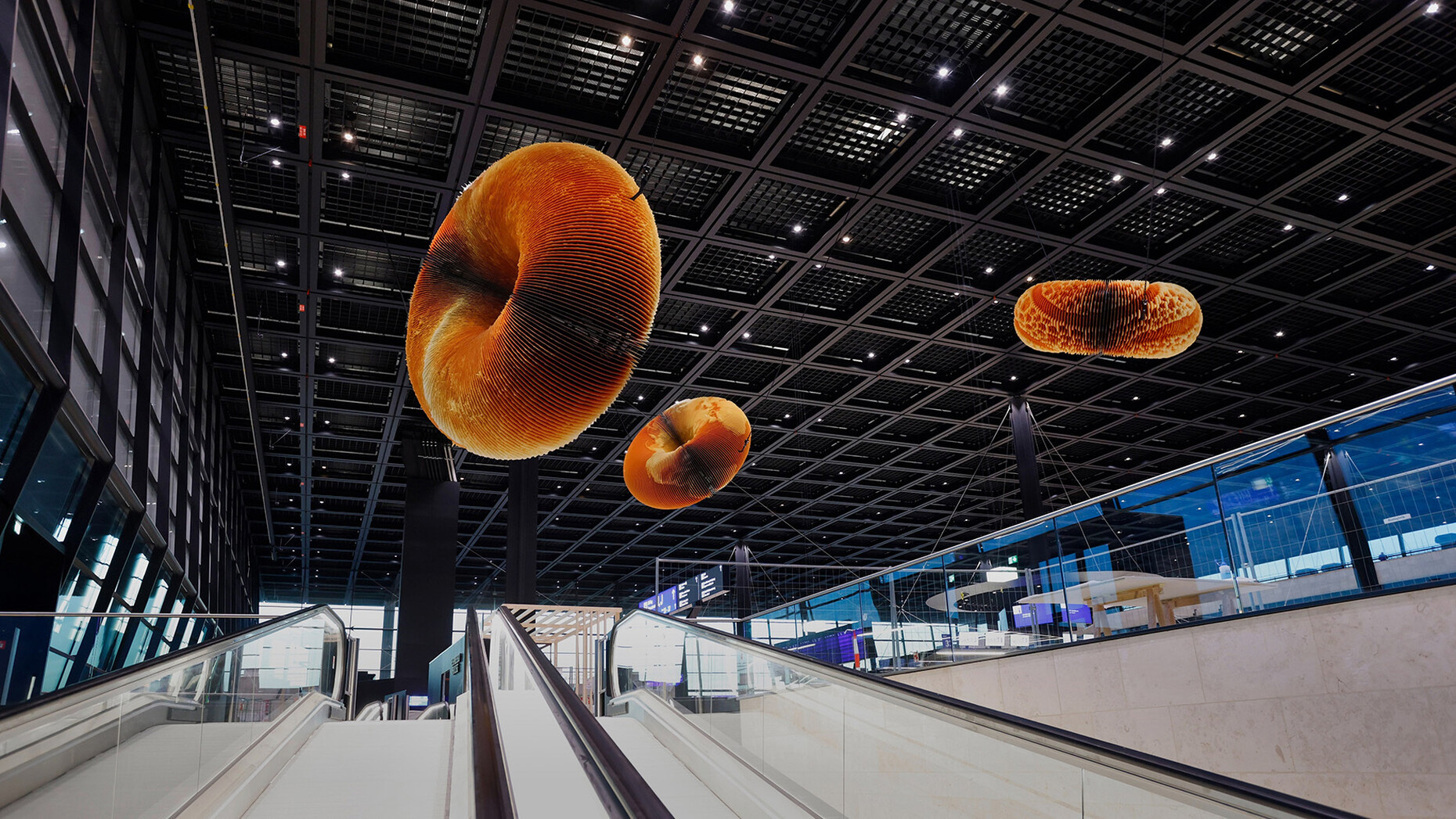 Der Ortlosigkeit begegnen Christoph Mäckler und sein Team mit einer nachgerade ironischen Geste: die große Empfangshalle, in der die Check-in-Schalter Platz finden, ist eine Interpretation der wohl ortlostens Architektur der Bundesrepublik, nämlich der schönen Halle von Ludwig Mies van der Rohes Neuer Nationalgalerie. Entworfen hatte van der Rohe den Bau 1957 für Kuba, wo es als Hauptquartier eines Rum-Produzenten dienen sollte, realisiert wurde es zwischen 1962 und 1968 als wenig funktionaler, aber ikonischer Museumsbau im märkischen Sand Berlins. Es ist ein wahrlich eindrücklicher Raum, der dem Frankfurter Büro mit dieser Interpretation gelungen ist, kongenial ergänzt durch die hypnotisierende kinetische Skulptur "The First, the Last, Eternity" des Künstlers Julius von Bismarck. Wie große Donuts hängen die drei aus eingefärbten Aluminium-Scheiben gefertigten Objekte unter der 18 Meter hohen Decke, drehen sich dabei sowohl in sich als auch um die eigene Achse. So wirkt es, als krempelten sie sich eigenständig fortlaufend selbst um. Die Scheiben, die die Ringformen bilden, weisen unterschiedliche Silhouetten auf, sodass sich dauerhaft verändernde Musterungen auf den Oberflächen der vom Auge zu Rotationskörpern vervollständigten Objekte bilden. Eines zeigt die Topografie der Erdoberfläche. Nichts stört den Blick unter diesem großen, weitspannenden Dach, dennoch hätte man auch der Halle schönere, vom Architekturbüro geplante, Espresso-Bars gegönnt, und nicht jene lieblosen Holzverschläge, die jetzt dort stehen.