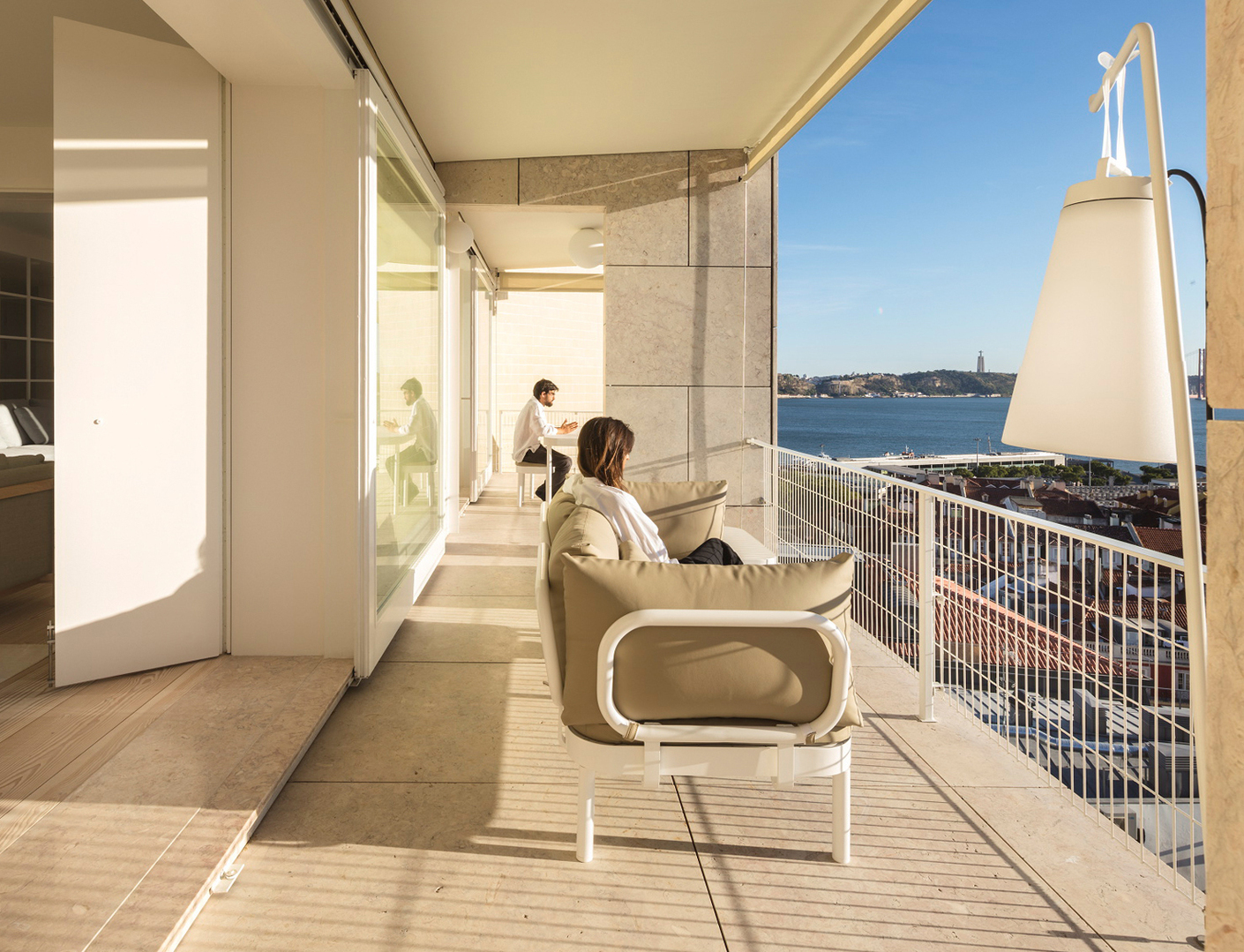 Wenn eine Wohnung im Terraços de Bragança, einem Apartmenthaus des portugiesischen Großmeisters Alvaro Siza Vieira, verändert werden soll, ist Fingerspitzengefühl gefragt. Die Architekten von rar.studio beschränkten sich daher auf die Entfernung von Teilen der Wand zwischen Wohn- und Esszimmer. Zudem wurden die Türhöhen in der Wohnung angeglichen und der Boden mit breiten, hellen Holzdielen ersetzt. Als Extra entwarfen sie lineare Möbeleinbauten und statteten die Bäder mit großzügige Flächen aus Marmor aus. Und die Klarheit der Räume zu unterstreichen und gleichzeitig ihre Strenge abzumildern, wählten sie für das Interieur Polstermöbel in sanften Nudetönen und Grau mit abgerundeten Formen. Die Akzente setzen metallische Wohnaccessoires, wie die Atollo Tischleuchte Gold von Oluce.